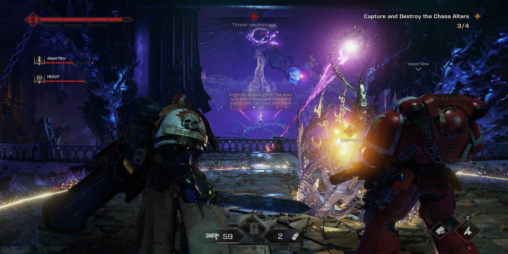 A medida que el escuadrón destruye los altares, Demonhost lanzará proyectiles mágicos y detonará el suelo debajo de los jugadores, que se pueden esquivar en el momento preciso. Al menos dos jugadores deben permanecer en el radio del altar.lo que acelerará ligeramente la tasa de captura del altar. Una vez que los cuatro altares hayan sido destruidos, el Demonhost será desterrado y la Operación se completará. Diviértete trabajando en esta misión para obtener EXP rápida y fácil en Warhammer 40,000: Marines Espaciales II.