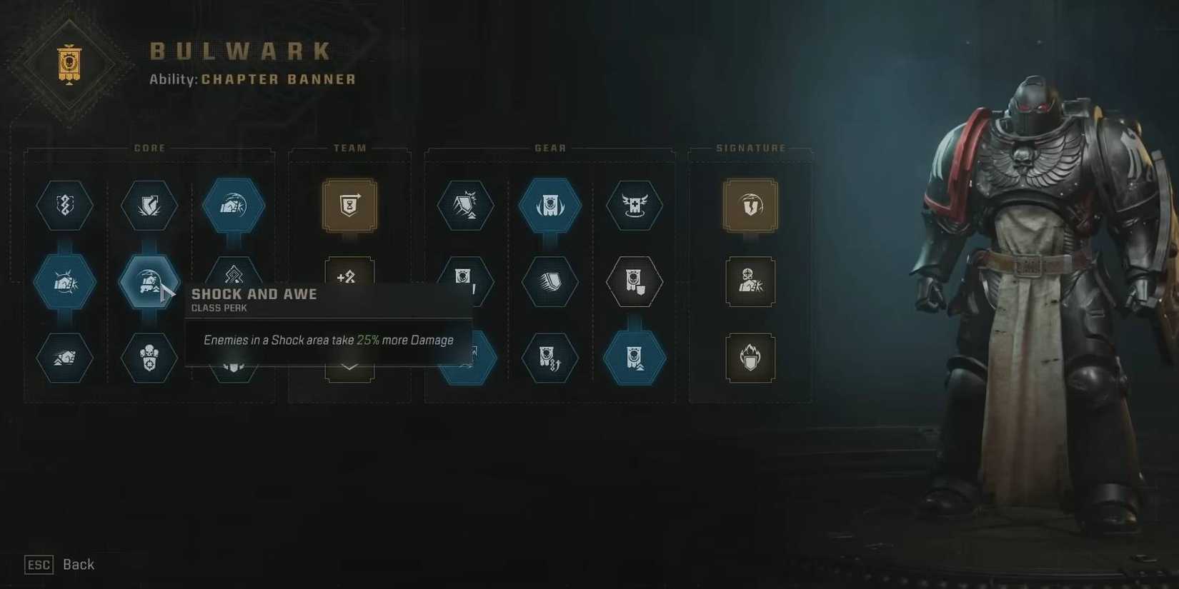 Otro aspecto central del Bulwark es la clase Banner del capítulo habilidad, que es la ventaja distintiva que recibes como parte del arquetipo. Cuando activas esta habilidad, Restaura tu armadura y la de todos los miembros del escuadrón dentro de un radio pequeño.brindando protección de emergencia a tus aliados. No importa qué contenido explores en Marine espacial 2El banner del capítulo es extremadamente útil para mantener a tus amigos con vida en una pelea.
