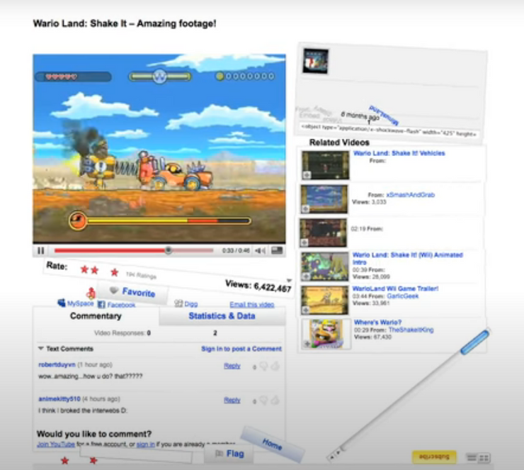 Wario Land: ¡Sacúdelo! Sin embargo, tuvo una campaña de marketing bastante interesante antes de su lanzamiento en 2008. En los primeros días de YouTube, Nintendo publicó un avance del juego que se metía específicamente con la página web, derribando cajas en la pantalla y esparciendo monedas en la sección “Videos relacionados”. Afortunadamente para aquellos interesados en la historia de los videojuegos, el canal de YouTube videogameclipcollect publicó un video en 2018, mostrando el avance y cómo los espectadores podían interactuar con él.