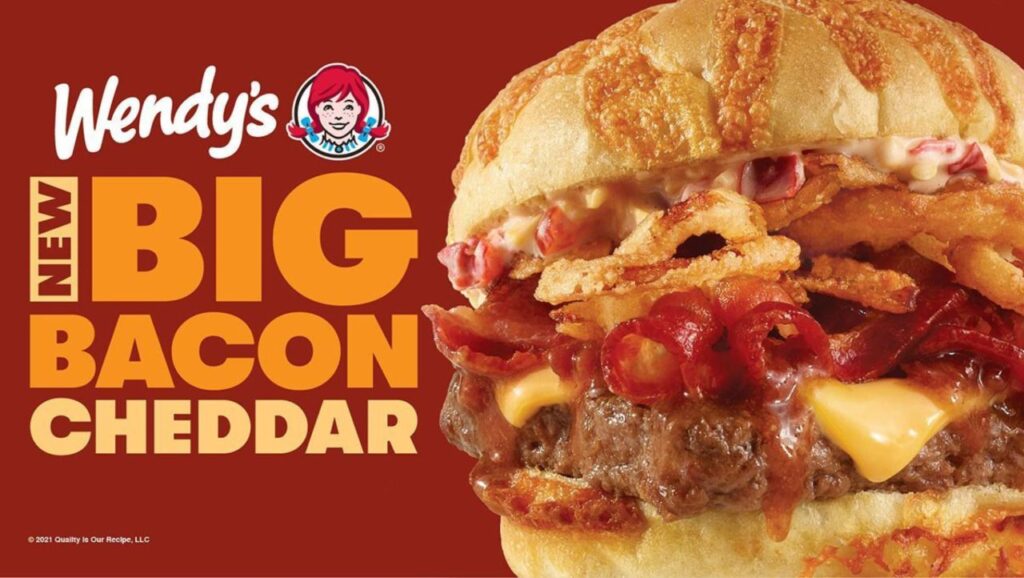 La nueva Big Bacon Cheddar Cheeseburger presenta carne de res fresca, nunca congelada de Wendy’s cubierta con su tocino ahumado Applewood, una salsa de tocino personalizada con un toque de dulzura, cebollas crujientes, queso americano y una salsa de queso cheddar cremoso y picante alojado en una primera bollo de queso cheddar tostado único en su tipo. Según Wendy’s, el sándwich “cambia la noción de una hamburguesa con queso y tocino tradicional en su panecillo con una sofisticación culinaria incomparable y una explosión de sabores grandes y atrevidos”.