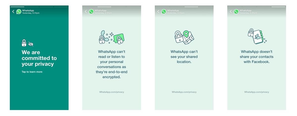 “Con estas actualizaciones, nada de eso está cambiando. En cambio, la actualización incluye nuevas opciones que las personas tendrán para enviar mensajes a una empresa en WhatsApp y brinda mayor transparencia sobre cómo recopilamos y usamos los datos. Si bien no todos compran con un negocio en WhatsApp hoy, creemos que más personas optarán por hacerlo en el futuro y es importante que las personas conozcan estos servicios. Esta actualización no amplía nuestra capacidad para compartir datos con Facebook ”, escribió WhatsApp hoy.