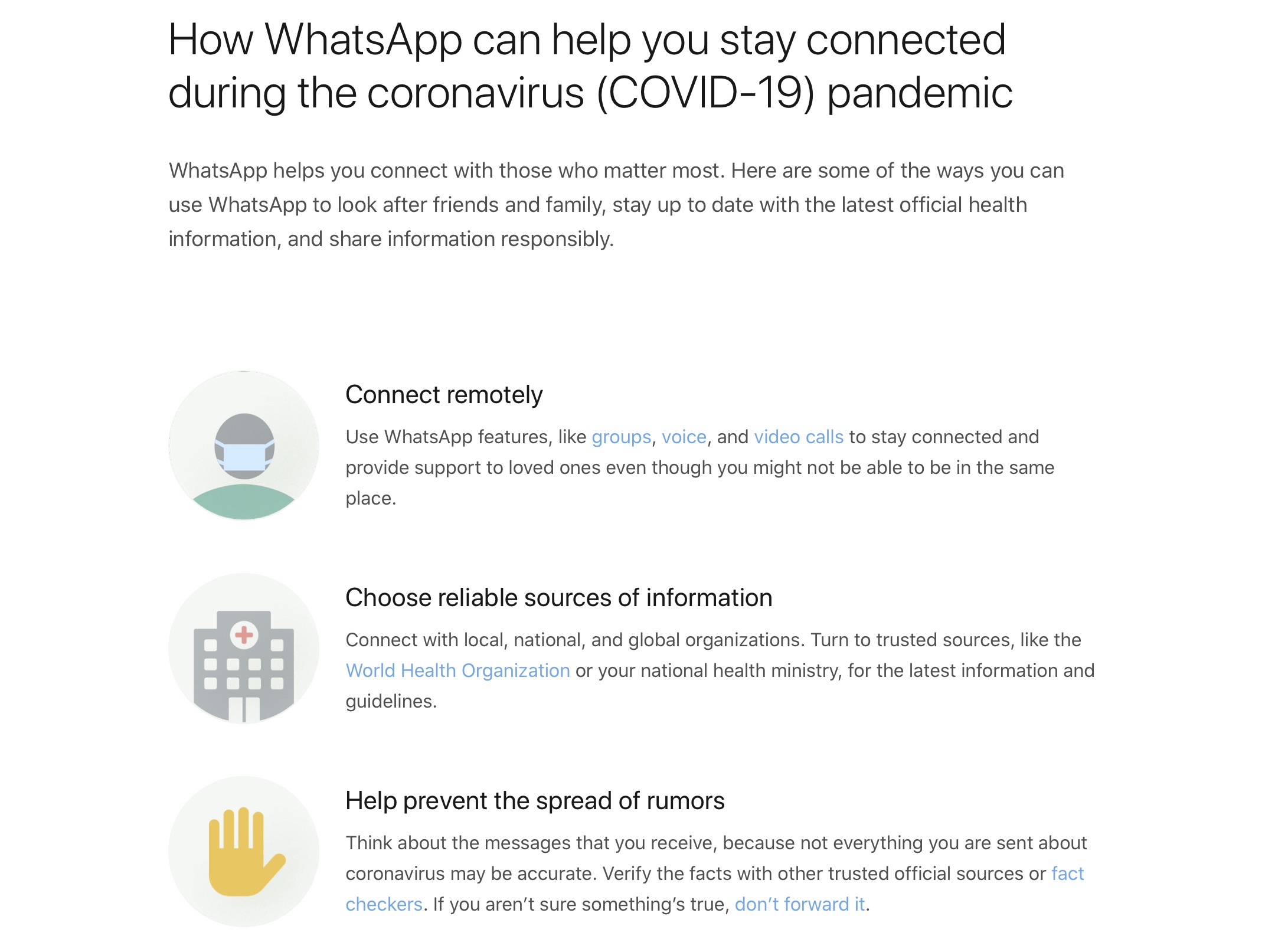 El Facebook El propio servicio de mensajería instantánea anunció WhatsApp Coronavirus Information Hub, para el cual se ha asociado con la OMS, UNICEF y el PNUD, para ofrecer una guía simple y práctica, consejos generales y recursos para que los usuarios de todo el mundo estén mejor informados sobre la enfermedad y, por lo tanto, Reducir la propagación de rumores.