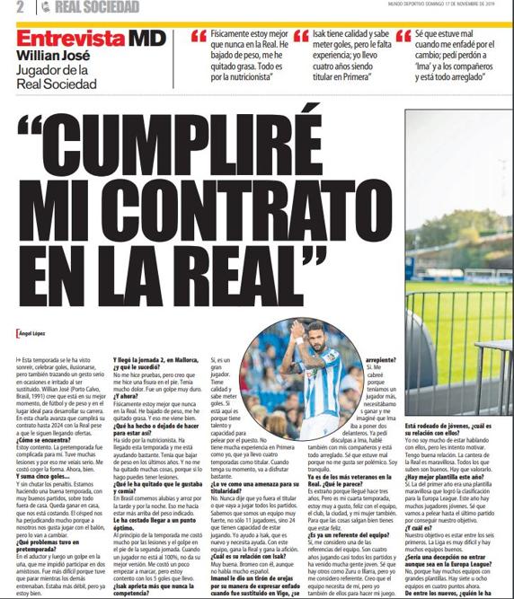 Entrevista de Willian José con Mundo Deportivo del pasado 17 de noviembre de 2019