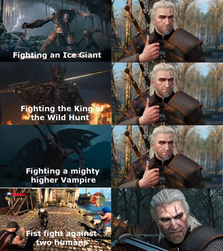 En un meme brillante que resume perfectamente las inconsistencias de los villanos, se ve a Geralt angustiado por una pelea a puñetazos con dos humanos después de derrotar fácilmente a los malos mucho más desgarradores. Por divertido que parezca, la dinámica es absolutamente cierta.