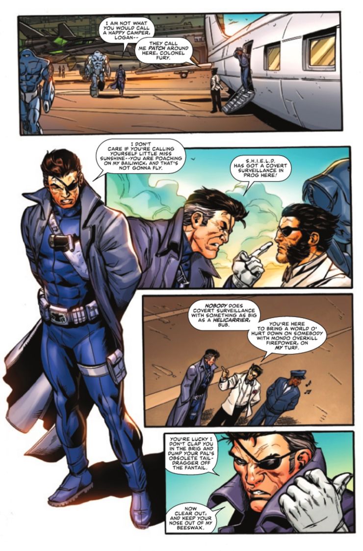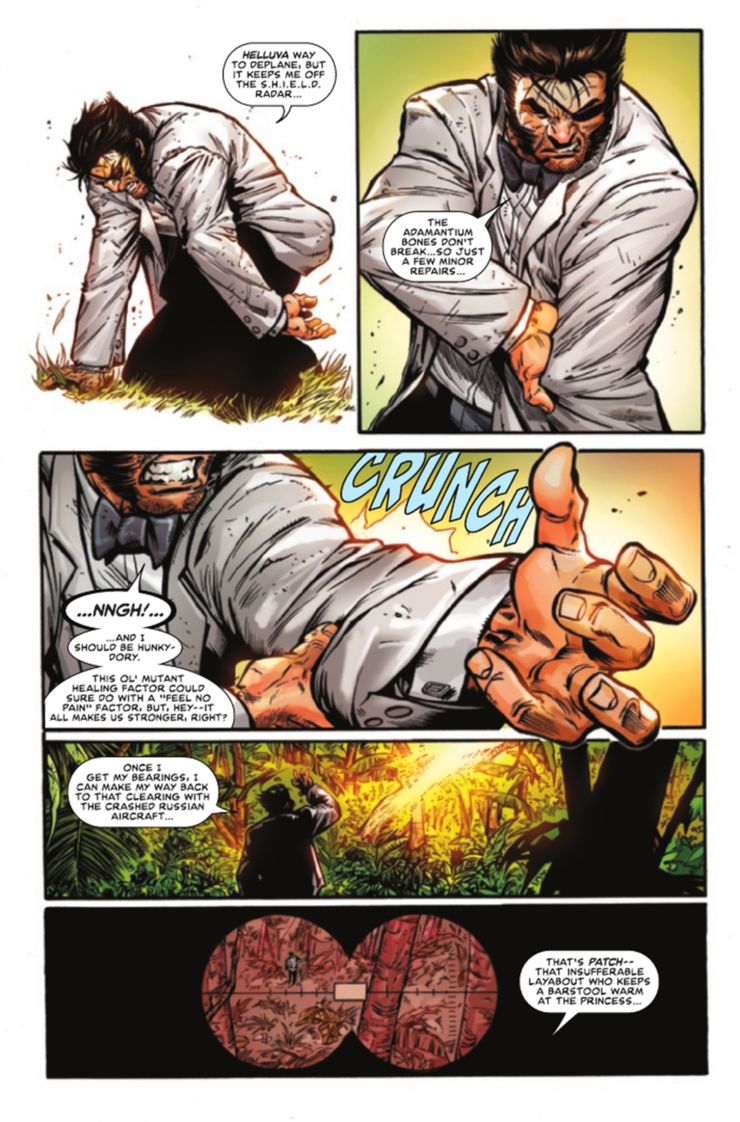 Los fanáticos tendrán la oportunidad de ver una aventura inexplorada en ese capítulo en particular de la vida del mutante en Lobezno: Parche #1 por Larry Hama y Andrea Di Vito. Bajo su nueva identidad, Wolverine se encuentra en desacuerdo con el director de SHIELD, Nick Fury, quien exige que desaloje el área. Mientras Logan surca los cielos, su socio le informa que no hay manera de que se acerquen al espacio aéreo de SHIELD sin ser detectados. Afortunadamente, el héroe ya tiene un plan en mente y, como cualquier superespía valiente, salta de un avión de cabeza. Pero a diferencia de Bond, Wolverine depende de su factor curativo y su esqueleto de adamantium para sobrevivir a la caída.