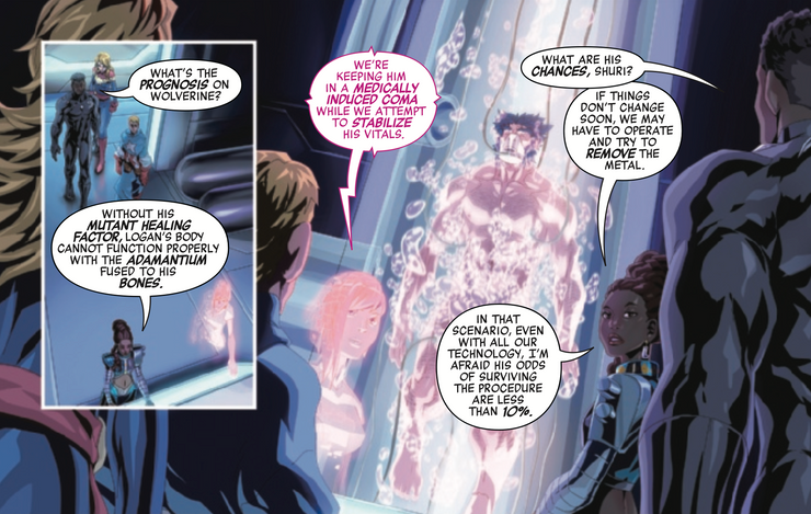 Los Vengadores apenas escapan del Cráneo Rojo y hacen balance de la batalla. Todos perdieron sus poderes, pero Wolverine es el único héroe que se ha puesto inmediatamente en peligro mortal por las acciones de Red Skull. La princesa Shuri describe la situación: “Sin su factor de curación mutante, el cuerpo de Logan no puede funcionar correctamente con el adamantium fusionado a sus huesos”. Shuri lo colocó en un coma inducido médicamente en el ínterin; no servirá de mucho en una pelea hasta que se resuelva el problema. Parece que incluso con la tecnología avanzada de Wakanda, las probabilidades de Logan son bastante sombrías: Shuri coloca sus posibilidades de supervivencia en menos del diez por ciento.