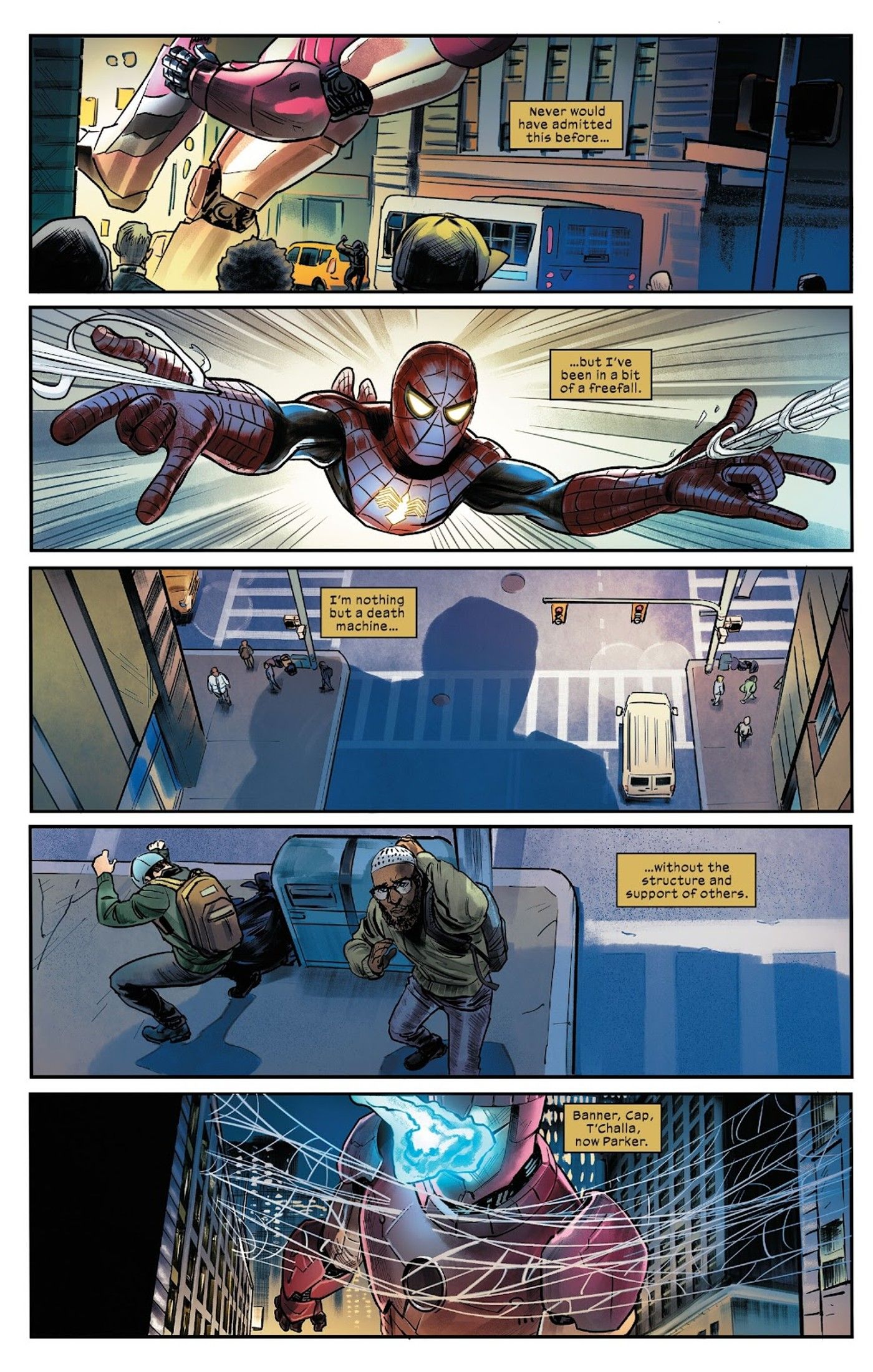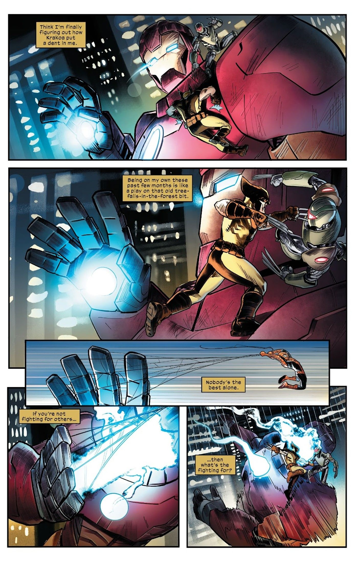 Glotón El número 40 explica por qué Logan se ha comprometido con tantos equipos últimamente, formando breves alianzas con Hulk, el Capitán América, Black Panther y ahora Spider-Man. Lo mismo se puede decir de por qué frecuentemente se asocia con su amigo y colaborador, el agente de la CIA Jeff Bannister, a quien Logan hace todo lo posible para enviar un mensaje sincero, cuando cree que no podrá regresar del espacio. Wolverine expresa que ningún hombre es una isla, y Cuanto más se alejaba Krakoa de la sociedad mundial en general como una isla que dependía únicamente de sí misma, más comenzaba a desviarse de su propósito original.