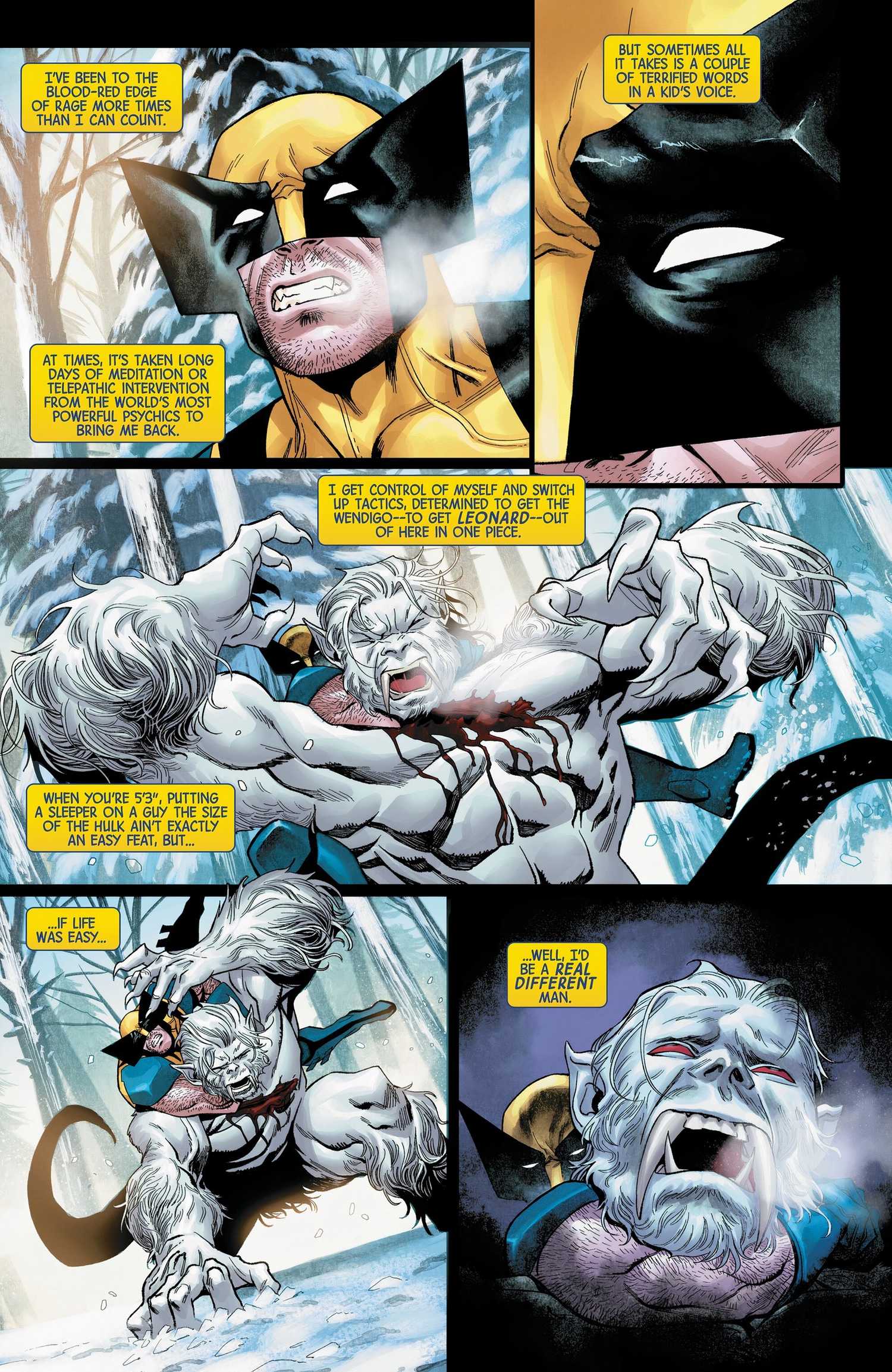 Continuando con la historia del último número de Wolverine haciendo todo lo posible para contener y defender simultáneamente a un adolescente llamado Leonard después de haber sido infectado con la maldición del Wendigo, Logan pronto se ve obligado a incapacitar a Leonard mientras el niño lucha por contener su lado más monstruoso. Al cortar a Leonard con sus garras después de que Wolverine cediera a su temperamento salvaje, Logan se da cuenta de que Leonard está haciendo todo lo posible para no perderse también en sus instintos más básicos. lo que llevó a Logan a ponerle “un durmiente a un tipo del tamaño de Hulk”, lo que demuestra cómo Wolverine puede derrotar a Hulk en el futuro.