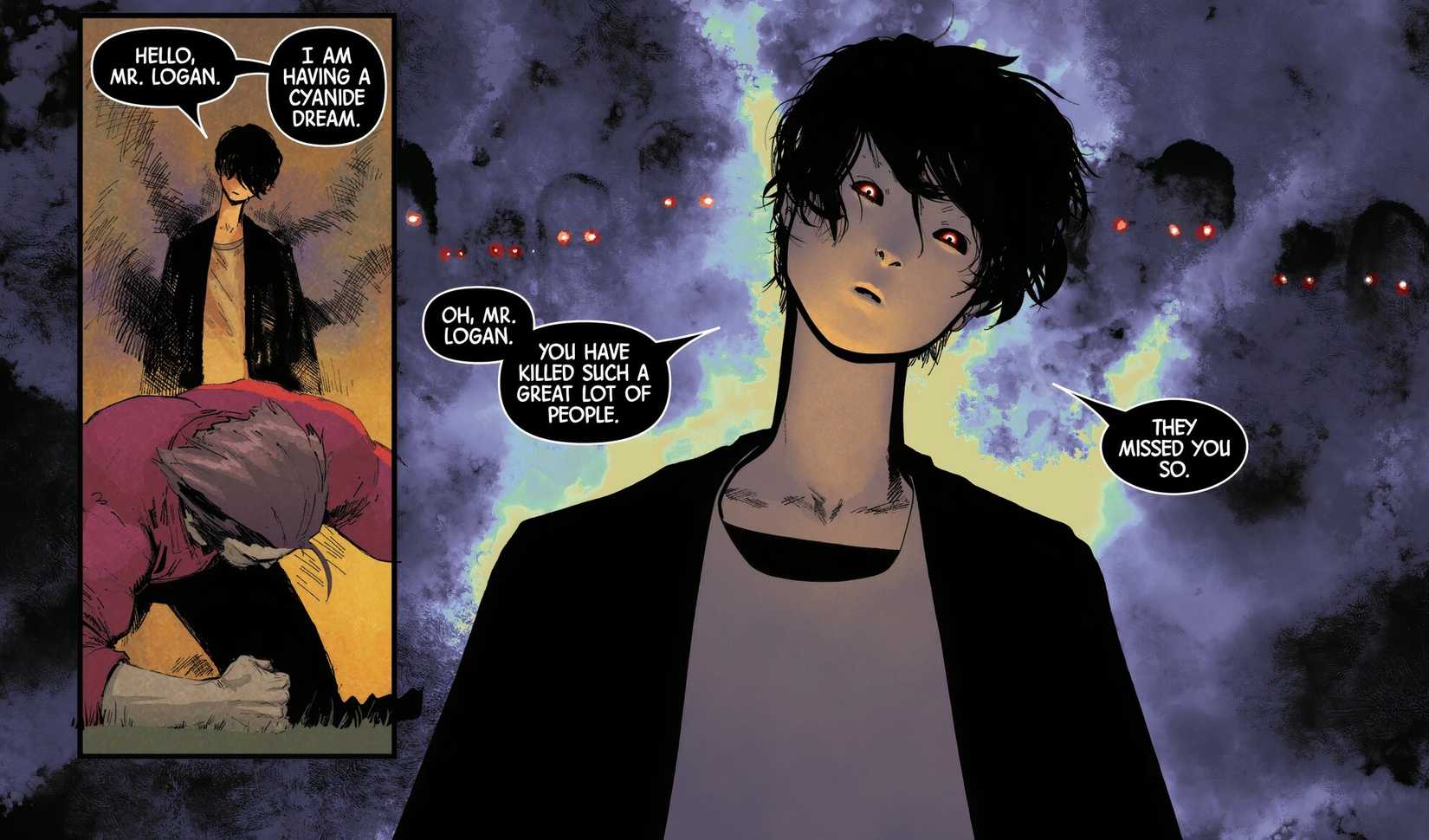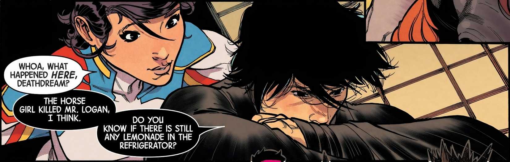 Si bien hasta ahora no se sabe mucho sobre la vida de Deathdream, está claro que se siente reconocido alrededor de Wolverine. Mientras que el resto de sus amigos no logran comprender la horrible naturaleza de su vida eterna, Wolverine acepta las peculiaridades góticas de Hotoru sin lugar a dudas. Porque Logan conoce la muerte, conoce la oscuridad y conoce la violencia sin sentido que puede vencer fácilmente una mente debilitada. Wolverine ha recorrido este camino durante siglos y, aunque nunca le gusta ver a otros obligados a hacer lo mismo, tiene una debilidad particular por los jóvenes que lo hacen.