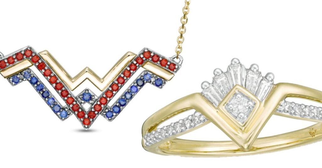 La colección incorpora el emblema icónico de Wonder Woman, el lazo, la tiara e incluso su enemigo, Cheetah, en los diseños. Puede elegir entre anillos, colgantes, aretes y pulseras hechas con oro, plata, diamantes, granates y zafiros. Muchos de los diseños presentan un sutil oro y plata con aspecto de diamantes, pero también hay estilos más audaces que utilizan múltiples piedras preciosas en azul y rojo. Puede comprar la colección completa aquí en Zales con precios que van desde $ 249.99 hasta $ 749.99.