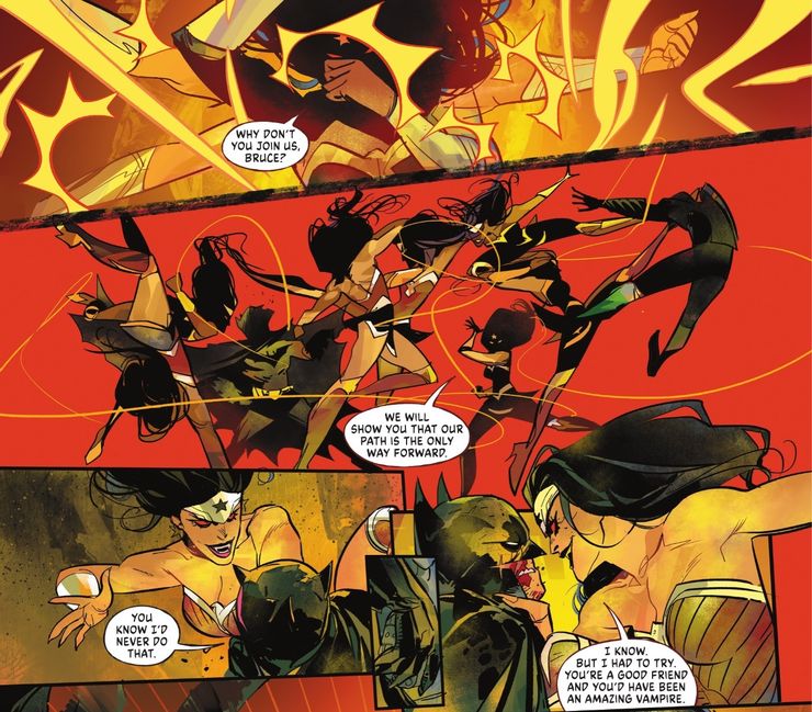 Desafortunadamente, eso no ha impedido que los vampiros secretos Green Lantern y Wonder Woman convenzan al resto de la Liga de que Batman es el que ha sido mordido (una suposición fácil de hacer). Siendo un justiciero nocturno que ya se viste como un murciélago y se mueve en las sombras, Bruce Wayne es, naturalmente, un candidato ideal para convertirse en vampiro. Asimismo, una Mujer Maravilla vampírica dice tanto en DC contra vampiros #5 después de que el Caballero Oscuro se niega a unirse a ella y Hal.