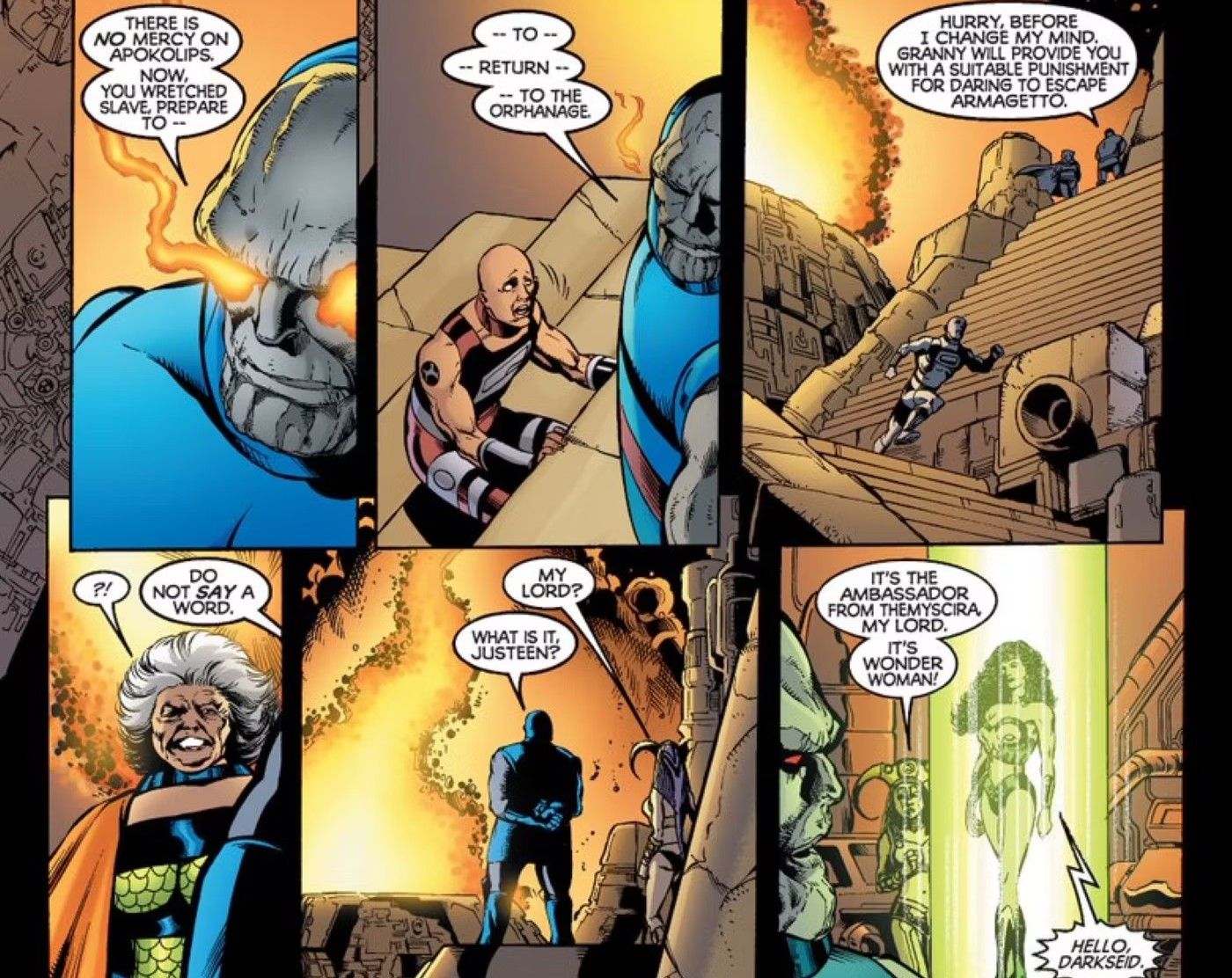 Wonder Woman derrotó a Darkseid sin siquiera levantar el puño; en cambio, ganó con amabilidad. Wonder Woman le revela al Dios Oscuro que cuando los poderes de las Amazonas fueron canalizados hacia él, también lo fue su esperanza y amabilidad. Ahora, una parte del alma de Darkseid ha sido infectada con la bondad de Wonder Woman, una pequeña parte, pero eventualmente crecerá hasta que las acciones de Darkseid sean dictadas por ella. Más tarde, se demuestra que esto es cierto. Después de que un esclavo intenta escapar del orfanato de Granny Goodness, lo llevan ante Darkseid para que lo castigue. Inicialmente, Darkseid tiene la intención de matar al pobre hombre, pero cede y, en cambio, muestra misericordia. Este cambio en el comportamiento de Darkseid, por leve que sea, muestra que Wonder Woman tenía razón al infectarlo con bondad; ahora es solo cuestión de tiempo hasta que la humanidad de Darkseid supere su maldad.