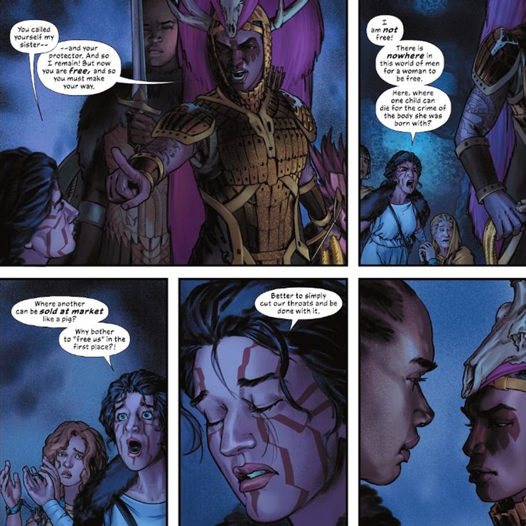 Las amazonas discuten dividirlas entre las distintas facciones, pero finalmente se toma la decisión de mantener unidas a las mujeres recién liberadas creando una nueva facción. Sirven a todas las diosas, en lugar de a una, y la líder acordada es Hippolyta. Si bien Hippolyta es conocida como una gran reina en las historias típicas de Wonder Woman, este es un nuevo origen fantástico para su papel y el camino que abre para otras mujeres. En lugar de simplemente salvar a las mujeres y dejarlas ser “libres”, reconoce que la libertad no es tan fácil de conseguir. Incluso si salen solos, es probable que aún se enfrenten a dificultades innecesarias. Hippolyta realmente forma una hermandad donde las mujeres pueden decidir cómo quieren vivir y morir, más allá de las normas y estructuras de la sociedad.