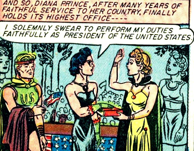 En 1943, Mujer Maravilla #7 presentó una historia en la que la heroína estaba celebrando que una mujer fuera presidenta de los Estados Unidos en el año 3000. Tiene lugar durante una campaña de reelección para la presidencia en 3004, en la que el “Partido de la Mujer” hace campaña contra el “Partido del Hombre”. .” Este cómic cuenta con el equipo creativo de William Moulton Marston y Harry G. Peter. En Themyscira, ella e Hippolyta plantean una pregunta a la Esfera Mágica sobre la capacidad de Diana para ser presidenta si se enfrenta a Steve Trevor. Los resultados son interesantes: el compañero de fórmula de Steve resulta ser un hombre torcido, que eventualmente amenaza su vida. El hombre también se abre camino para ser votado a través de un cambio de conteo de votos. Sin embargo, esta injusticia no se mantiene gracias a la heroicidad de Wonder Woman, cuyo alter ego en realidad gana la carrera presidencial de manera justa.