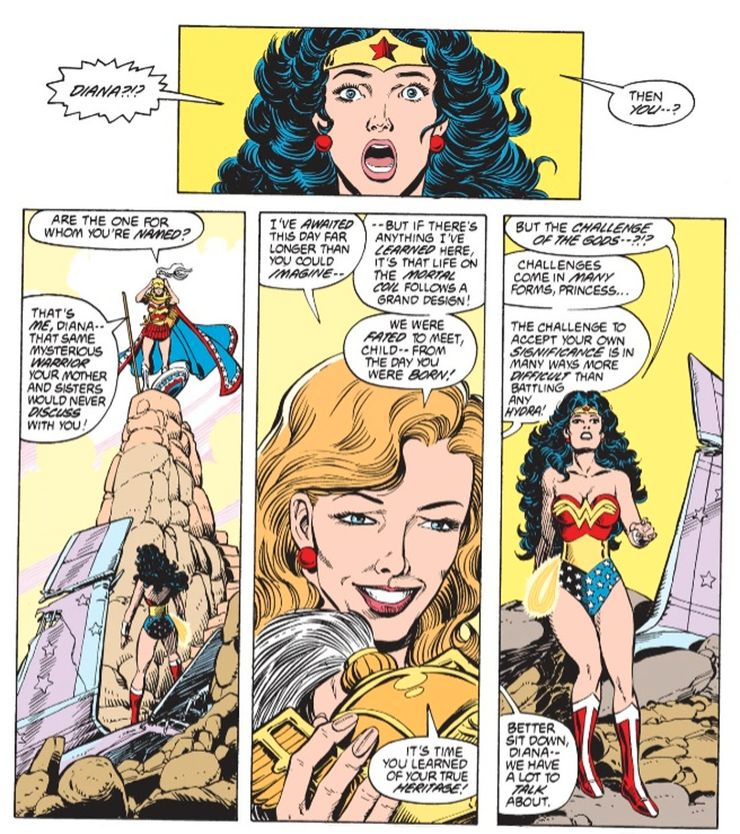 Diana Rockwell Trevor se presentó por primera vez en 1987 mujer maravilla vol. 2 #11 donde se dijo que después de luchar como piloto de la fuerza aérea en la Segunda Guerra Mundial, decidió volar una vez más, probando un nuevo avión experimental en lugar de ir al séptimo cumpleaños de Steve. Mientras estaba en el aire, fue alcanzada por un rayo y salvada por un grupo de nereidas (diosas marinas menores) antes de recuperar la conciencia en Paradise Island. Al despertar—en Mujer Maravilla Vol.2 #12—Diana ve que las Amazonas están luchando contra el monstruo demoníaco de múltiples brazos Cottus, que había escapado del Tártaro a través de la Puerta de Doom. Sin dudarlo, Diana saltó a la batalla y luchó contra Cottus usando su pistola, distrayéndolo lo suficiente como para que Philippus y Menalippe se salvaran, pero no antes de que ella misma fuera asesinada por el monstruo.