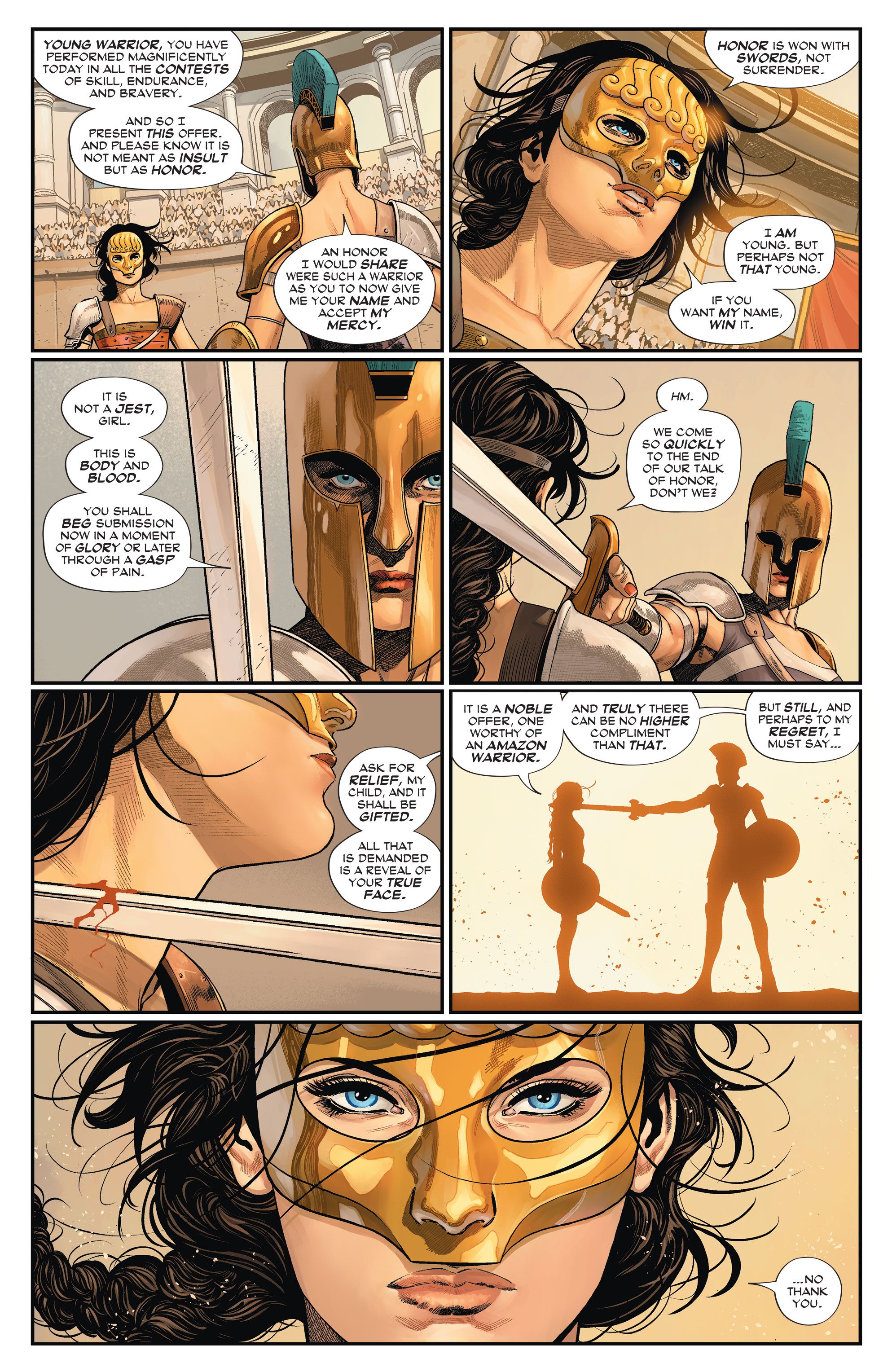 “/> En Mujer Maravilla #2En la doble apertura, a Diana se le ofrece misericordia dos veces: Steve Trevor no cree que pueda sobrevivir al ataque que se avecina y le ofrece un camino donde, si entrega lo que cree que es correcto, puede escapar del daño. El momento se compara con un caso similar en los primeros años de vida de Diana donde, si hubiera aceptado la misericordia de un guerrero, nunca habría abandonado Themyscira y se habría convertido en uno de los héroes más grandes de la humanidad. En cada caso, Diana reconoce el intento sincero de evitar que le hagan daño, pero se niega a ser definida por la idea que otra persona tiene de sus limitaciones, respondiendo: “No gracias.”