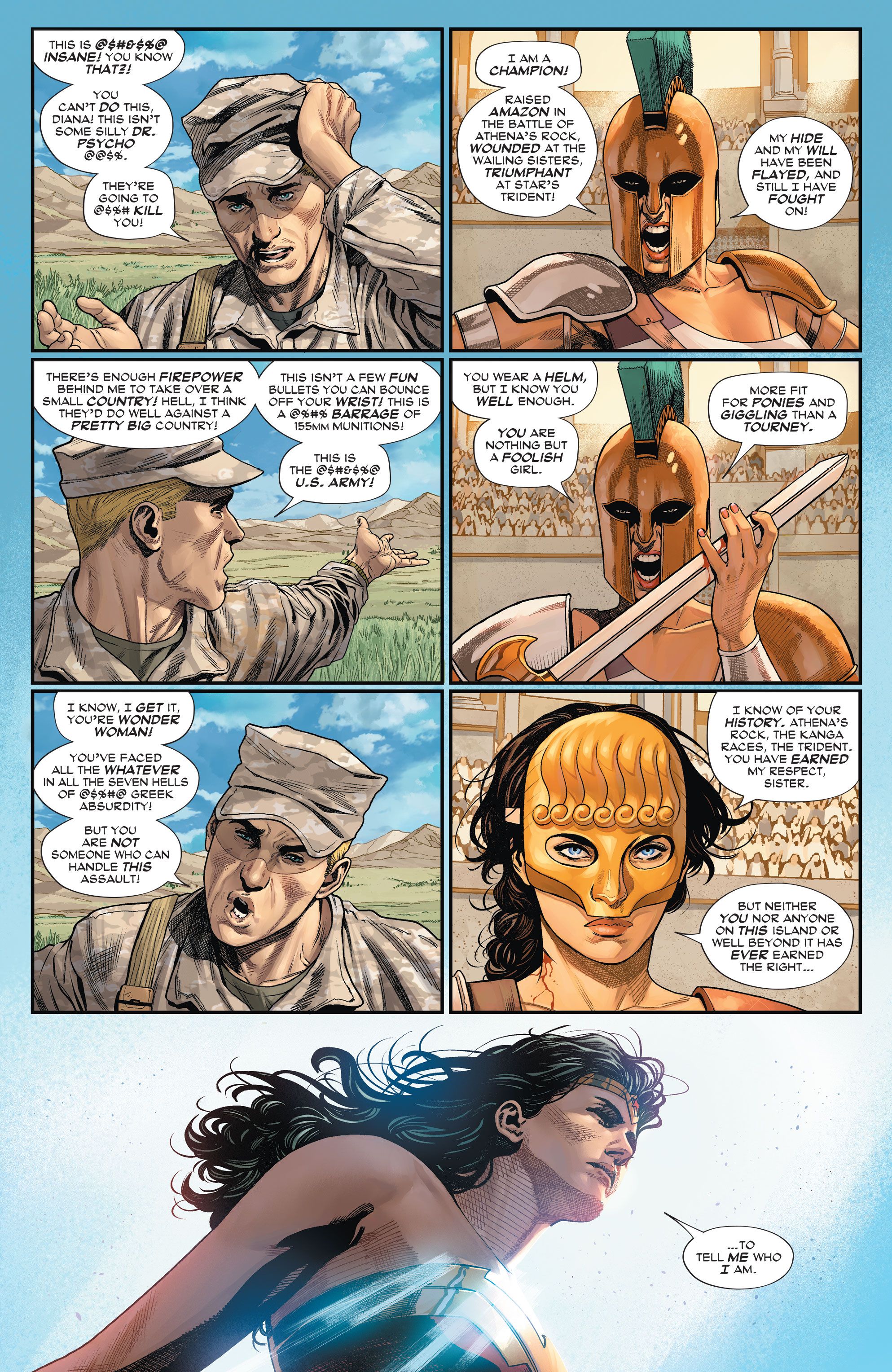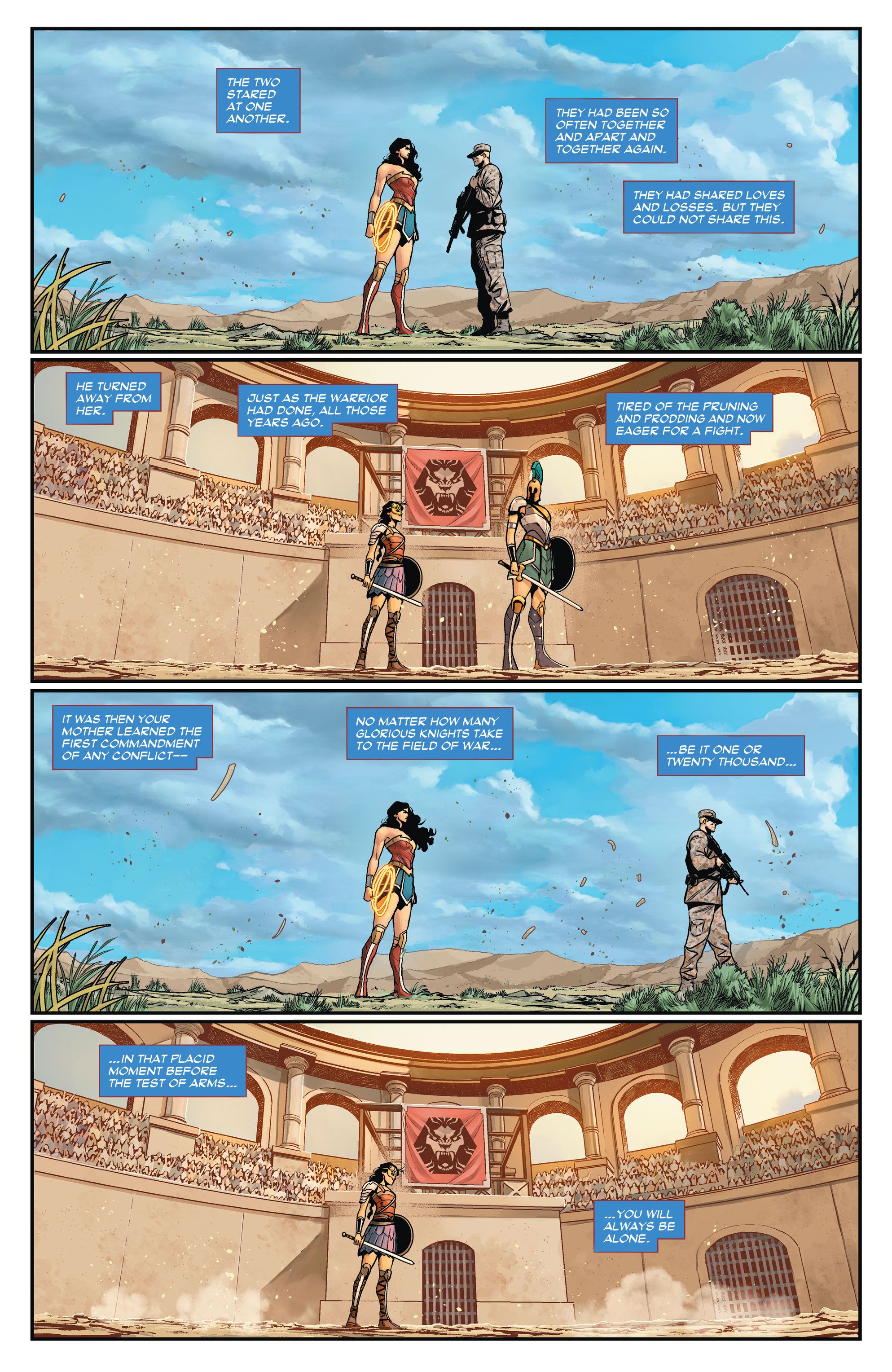 En un avance de Tom King, Daniel Sampere, Tomeu Morey y Clayton Cowles Mujer Maravilla #2, Wonder Woman se enfrenta a su antiguo interés amoroso, Steve Trevor, en el campo de batalla. Al mismo tiempo, la narración regresa al concurso que decidió qué Amazon se aventuraría al mundo exterior, un concurso que ganó la joven Diana y que cambió su vida para siempre.