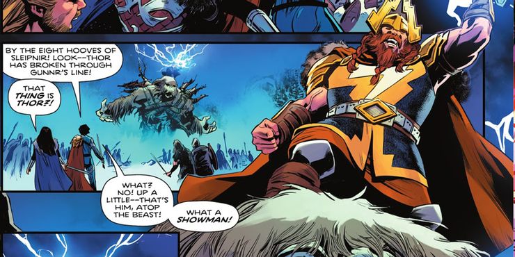Thor llega con estilo, montado en una bestia gigante (que se parece a un Yeti) mientras ataca las fuerzas de los vikingos con cargas eléctricas extraídas de su martillo Mjolnir. Wonder Woman señala que está “genuinamente impresionada” con Thor, mientras él destroza a los vikingos con facilidad. Thor tiene un aspecto bastante diferente de la versión de Marvel del dios nórdico, ya que tiene un rayo en su armadura y un casco dorado.