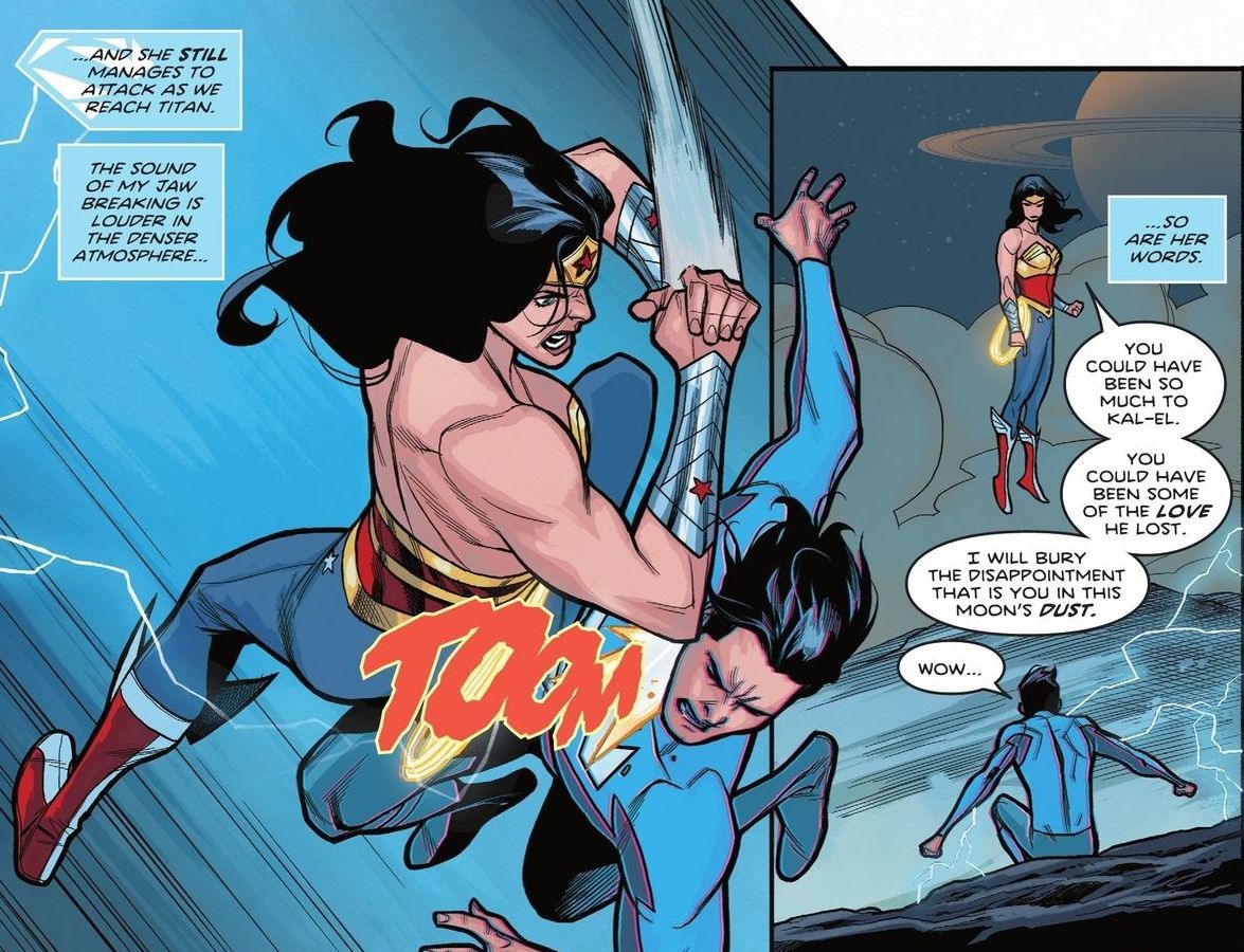 - Los huesos kriptonianos no son rival para el feroz poder de Wonder Woman, ya que rompe la mandíbula de Jon Kent con un brutal codazo.