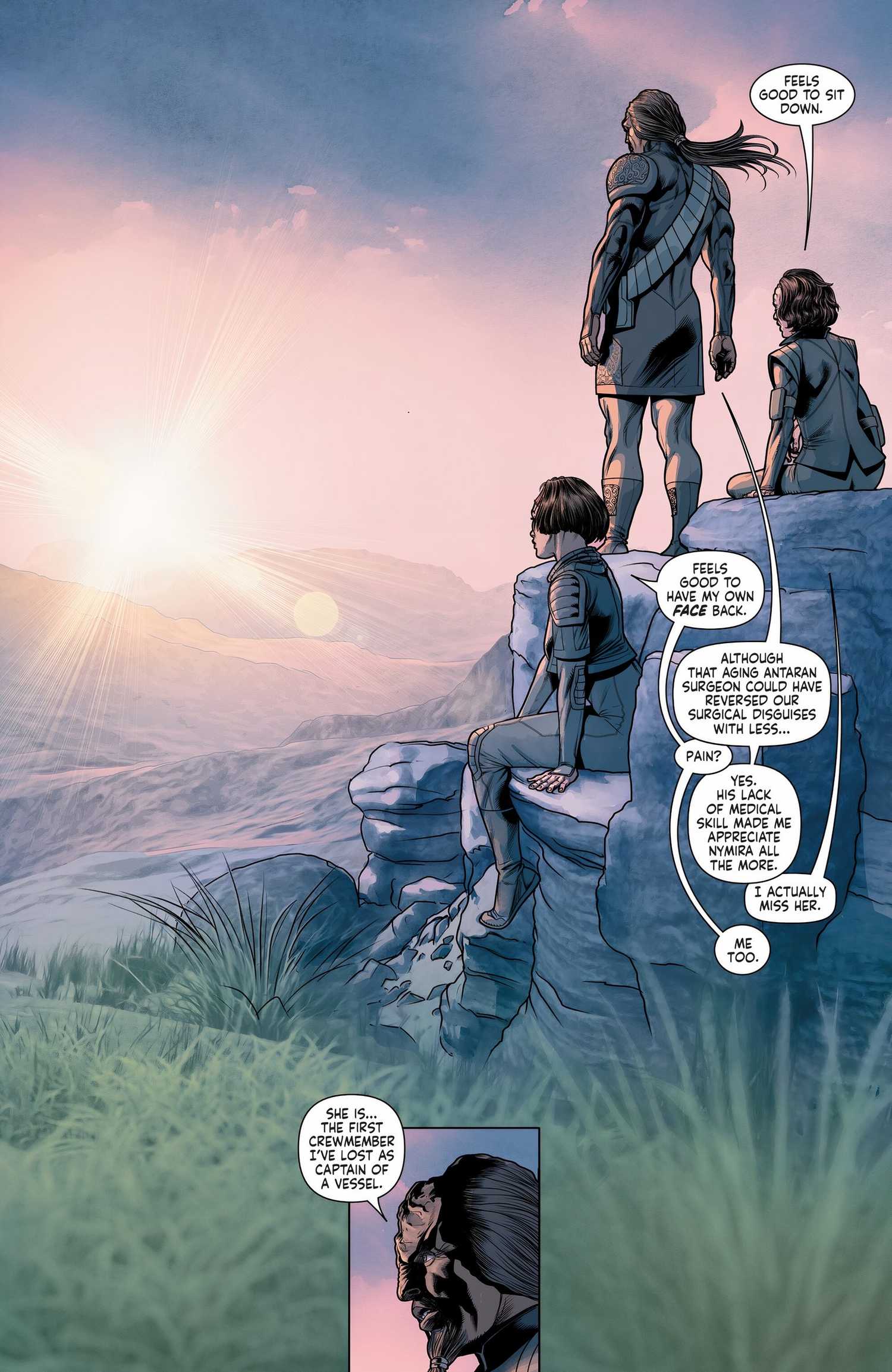 Star Trek: Desafiante El número 18 está escrito por Christopher Cantwell y dibujado por Angel Unzueta. Worf, B’Elanna Torres y Ro Laren están en el mundo natal de los Antaran, en el Cuadrante Delta. Los romulanos están en camino a conquistar el planeta y el trío pasa el tiempo nervioso. Worf reflexiona sobre la reciente pérdida de Nymira, la médica de Orión que se sacrificó para detener una invasión de parásitos alienígenas. Worf revela que Nymira es la primera persona que perdió bajo su mando.