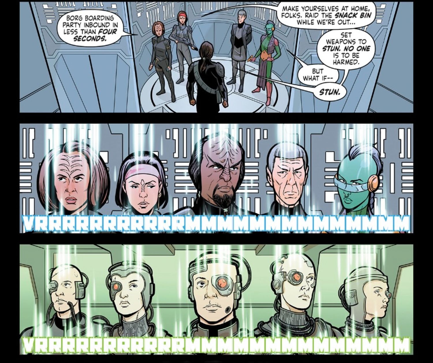 Star Trek: Desafiante #9, escrito por Christopher Cantwell, con arte de Mike Feehan, encuentra a la tripulación actuando como cazarrecompensas extraoficiales, persiguiendo objetivos clave a instancias de la Flota Estelar. Su primer encuentro es con el ex Borg Hugh y su tripulación de drones liberados, y las cosas no salen según lo planeado para la tripulación del Desafiante.