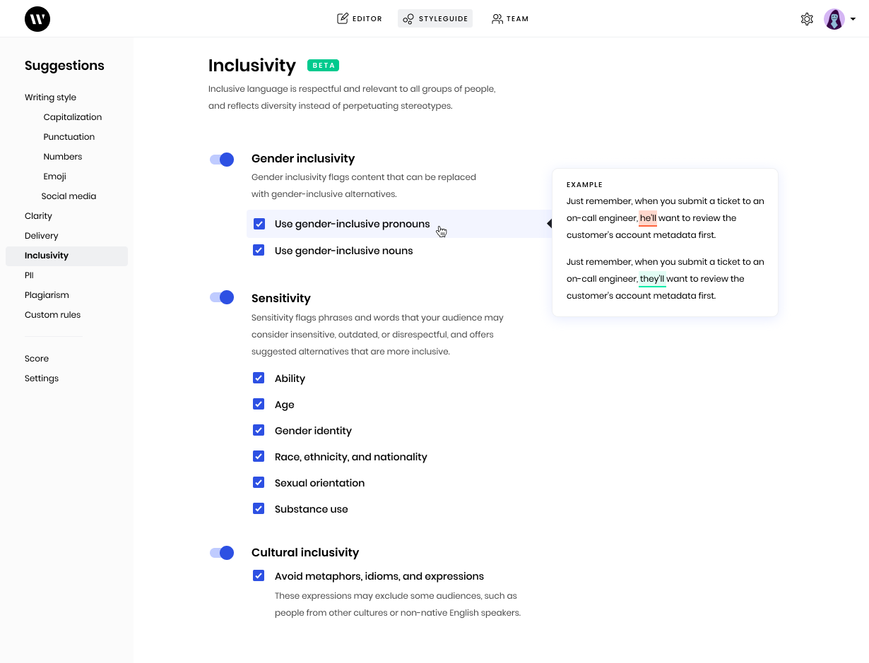 Hay toneladas de errores que todos cometemos en ese sentido, menos obvios pero no menos potencialmente ofensivos. Es importante en las comunicaciones públicas, entre otras cosas, referirse a un grupo por el término que prefieren, no el primero que se le ocurra; Writer tiene bibliotecas actualizadas de esta información obtenida de las propias comunidades. Es posible que algunas frases se hayan cargado políticamente en los últimos dos años, pero usted no lo sabe; No hay problema, tiene alternativas. Quieres evitar el lenguaje innecesariamente relacionado con el género, genial, pero todos cometen errores de vez en cuando; El escritor puede detectarlo, o hacer la conexión con pronombres anteriores para asegurarse de que, por ejemplo, no genere una fuente anónima.