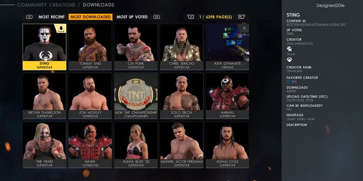 Una vez en esta sección, hay varias selecciones para que el jugador elija descargar. Hay superestrellas, imágenes, arenas, campeonatos, espectáculos, conjuntos de movimientos, dinero en los bancos y favoritos. Después de hacer una selección, el jugador verá varias opciones. Aquí es donde el jugador verá las creaciones cargadas en WWE 2K22.
