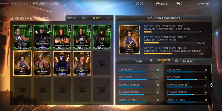 Por ejemplo, el jugador puede recibir una Becky Lynch dorada de un paquete de inicio. Encima de su nombre en la tarjeta, habrá una gema dorada rellena y una gema esmeralda vacía. Esto significa que el jugador puede actualizar la tarjeta de Gold a Emerald, pero no más. El jugador también podría recibir un Emerald Undertaker ’98 y encima de su nombre en la tarjeta, verá una gema de esmeralda rellena y luego gemas de zafiro, amatista y diamante vacías. Esto significa que el Undertaker ’98 se puede actualizar hasta el nivel Diamante, un nivel a la vez.