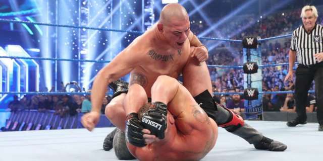 Después de ganar el Campeonato WWE en solo segundos de Kofi Kingston en Viernes noche BofetadaEn el estreno de FOX, Lesnar fue interrumpido por un Mysterio lesionado (un hombre que Lesnar atacó días antes) y el dos veces ex campeón de peso pesado de UFC Cain Velasquez. Lesnar tuvo una repentina mirada de miedo dado que Velásquez fue el hombre que le quitó su título de UFC en 2010, y el ex peleador rápidamente le quitó a Lesnar con un derribo y algunos golpes.