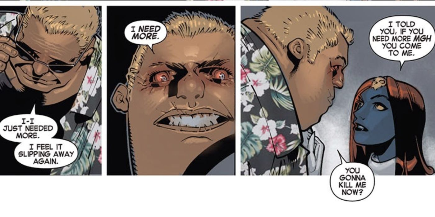 “/> Tras la catástrofe mundial de mutantes que fue el Día M, apareció en escena en Madripoor una droga que se conocía comúnmente como MGH (hormona de crecimiento mutante), y The Blob contrabandeó y comercializó MGH con Mystique. como su proveedor. Mystique y Blob venden MGH (que fue producido por Dazzler) para financiar sus esfuerzos por convertir a Madripoor en un santuario de mutantes y revitalizar la Hermandad de Mutantes Malignos con mucho dinero detrás.