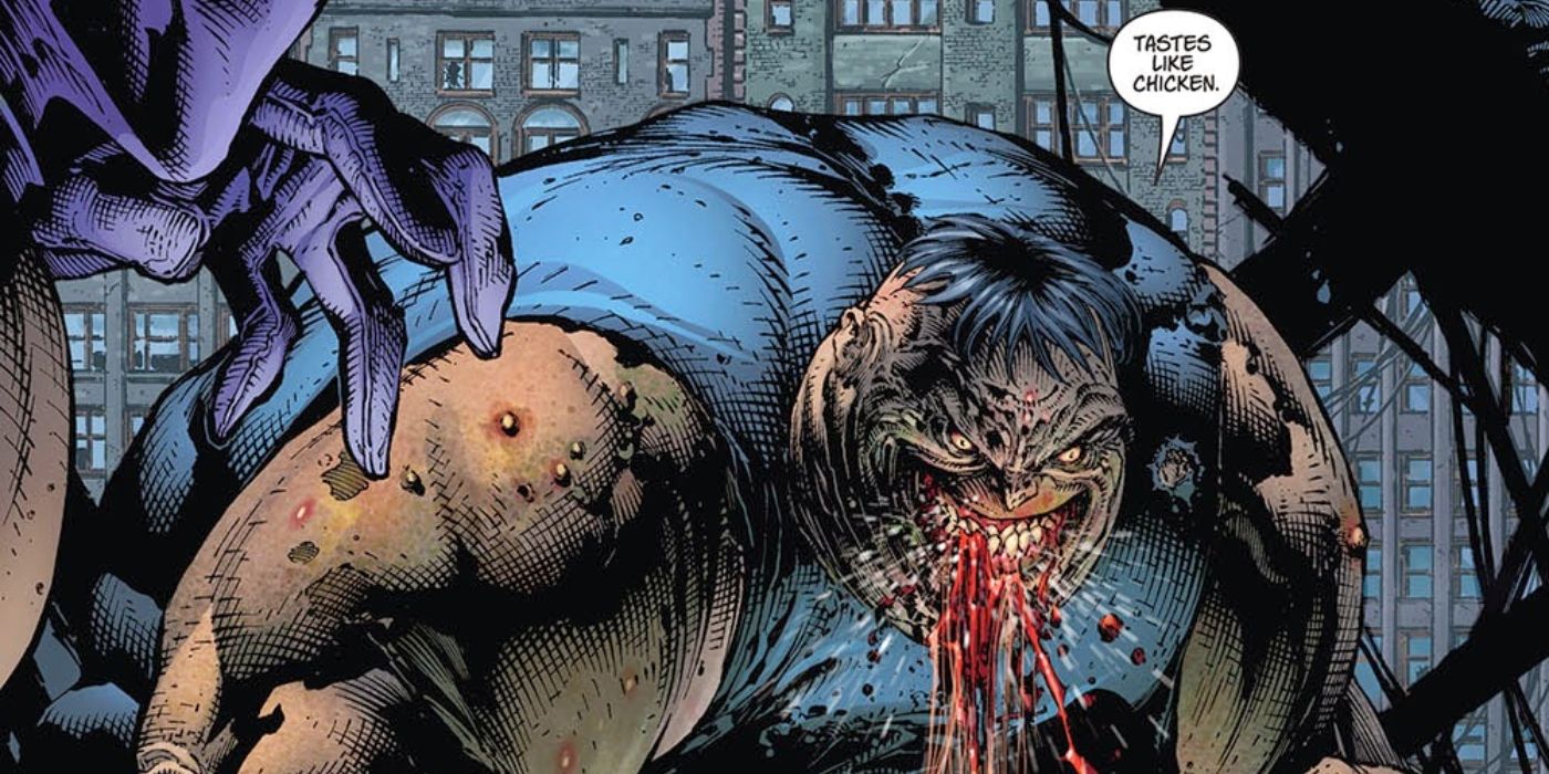 “/> Esta entrada se destaca por ser la única que no cita un momento del pasado villano de Blob dentro de la continuidad principal de Tierra-616 de Marvel Comics, sino más bien el del Universo Ultimate original (Tierra-1610). Sin embargo, este momento es uno de los más infames en la historia de Blob en Marvel Comics, independientemente de la versión del personaje. Al comienzo del evento Ultimátum, después de que Magneto inundara Nueva York, matando a millones como resultado, los Ultimates estaban ayudando a limpiar la ciudad y lidiar con las consecuencias. Mientras busca supervivientes, Hawkeye se topa con una visión de horror grotesco: la masa comiéndose a la avispa.