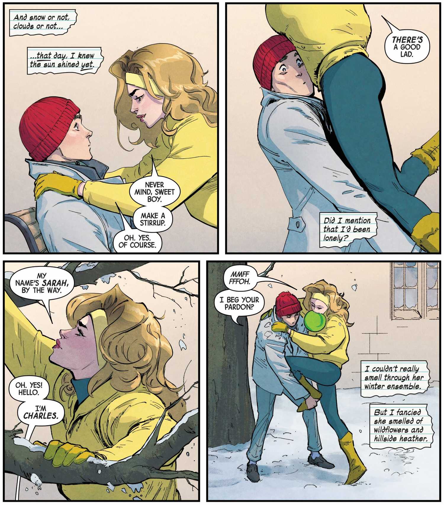 A partir de X-Men asombrosospoco se sabe oficialmente sobre Sarah Gaunt. Pequeños flashbacks revelan que ella en un momento sirvió como un interés romántico o una figura matrona para Charles Xavier. Antes de la época de los X-Men, mientras Charles todavía estaba en la universidad, Sarah se presenta a Charles, haciendo un punto en su pequeña charla para notar momentáneamente que es pagana. Si bien todavía no se sabe casi nada oficialmente sobre Sarah Gaunt, Marvel tiene otro personaje profundo con algunas similitudes con el villano actual de los X-Men: la vieja Sarah Mumford.