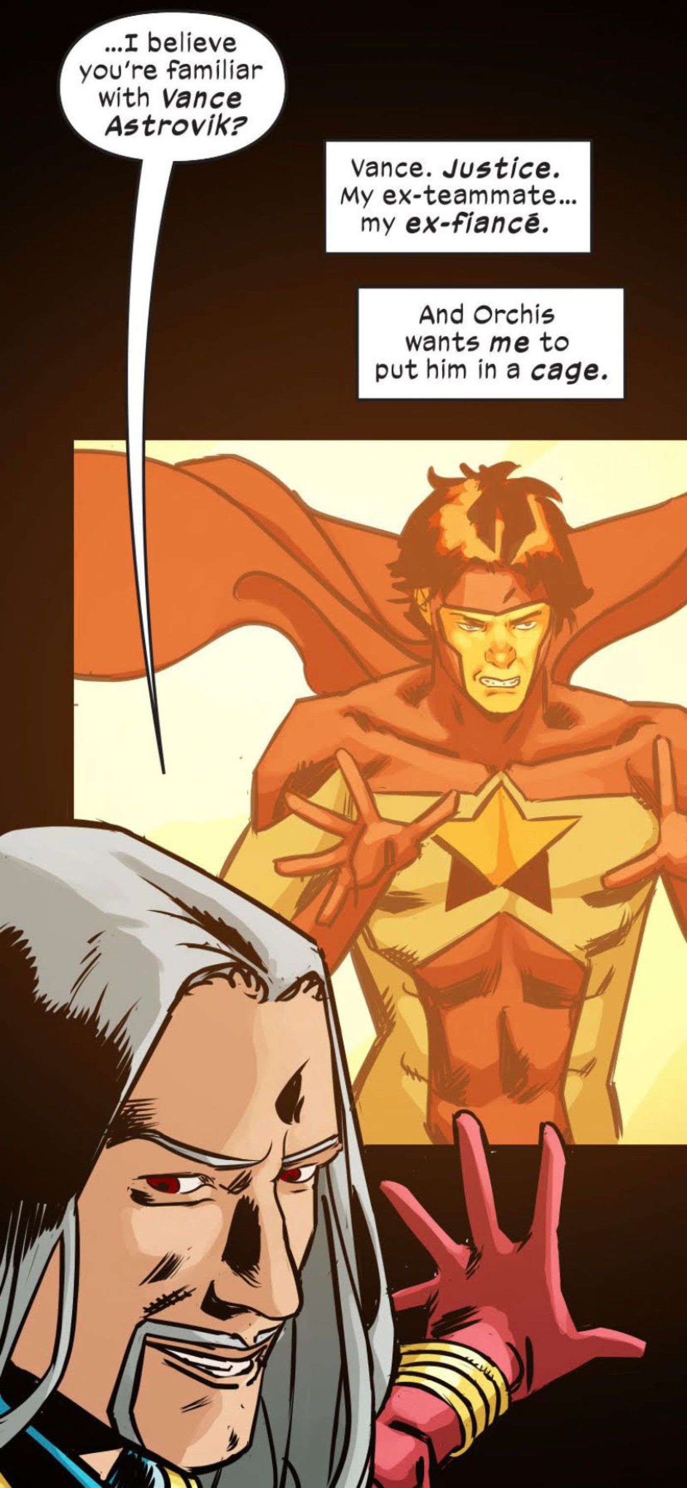 El poderoso telequinético Vance Astrovik, conocido popularmente como Justice, debutó en 1975. Defensores de tamaño gigante #5, y además de ser una parte importante de New Warriors, Avengers Initiative y Avengers Academy, es conocido por su relación romántica con Firestar.