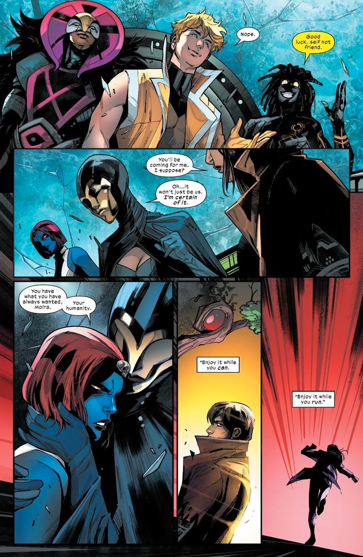 Desafortunadamente, en el momento en que Mystique usa el arma de Forge para convertir a Moira en humana, se encuentra con un gran problema: ya no puede matar a Moira, gracias a una de las tres leyes sagradas de Krakoa: Murder No Man. Mystique, a regañadientes, debe dejar que Moira abandone Krakoa en paz, para que no sufra el mismo destino horrible que Dientes de Sable: exiliarse en las profundidades de Krakoa. Mystique sufrió un terrible destino en la película después de ser abandonada por sus compañeros, pero aquí, la transición humana de Moira resultó ser el único elemento que le salvó la vida.