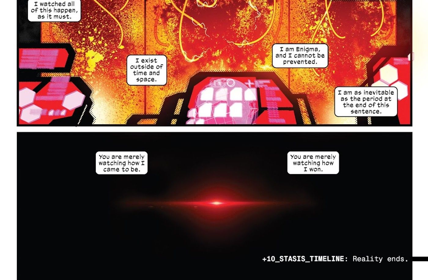 Una entidad cósmica oscura y vasta, con muchos nombres (Enigma, Dominio, La Corona Sobre Todas las Cosas) está llegando a consumir todo el Universo Marvel.