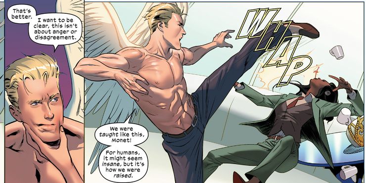 En X-Corp # 4, de Tini Howard, Alberto Foche y Sunny Gho, Angel y Penance llegan a un punto muerto. Sus diferentes enfoques sobre cómo navegar en el sector corporativo los ponen en desacuerdo, tanto que terminan peleando en el salón ejecutivo de X-Corp. En una sala de juntas normal, si dos miembros están en desacuerdo, lo discutirán sobre golf, una llamada telefónica acalorada o un tribunal de justicia; pero cuando se trata de mutantes cuyos únicos métodos aprendidos de resolución de conflictos son la lucha, conduce a la ruptura de un techo de cristal literal. Warren señala que, como estudiantes, se vieron obligados a luchar contra sus compañeros de clase en la Sala de Peligro para aprender a entenderse a sí mismos y comunicarse. Es posible que Monet y él no estuvieran en la misma clase, pero fueron criados de la misma manera. Ahora es todo lo que saben. Y aunque Monet lo calificó de “vieja escuela”, no se puede negar que se ha convertido en una parte profundamente enrutada de sus mentes.