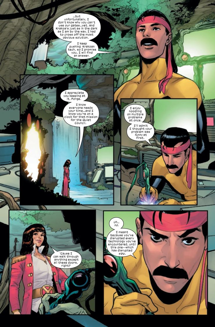 El problema ve a Pryde parado en una puerta en el laboratorio de Forge, incapaz de atravesarla. Ella le recuerda a Forge su “pequeño problema”. Forge no lo ha olvidado, pero a pesar de los mejores esfuerzos por su parte y por parte de Krakoa, no hay solución: todos están realmente perplejos. Pryde agradece a Forge por sus esfuerzos. Ella reconoce que lo están empujando en muchas direcciones, ya que otros mutantes necesitan su experiencia técnica; Pryde también menciona las misiones de Forge para el Consejo Silencioso. Forge le dice que le importa y que le gusta trabajar en varios proyectos a la vez.