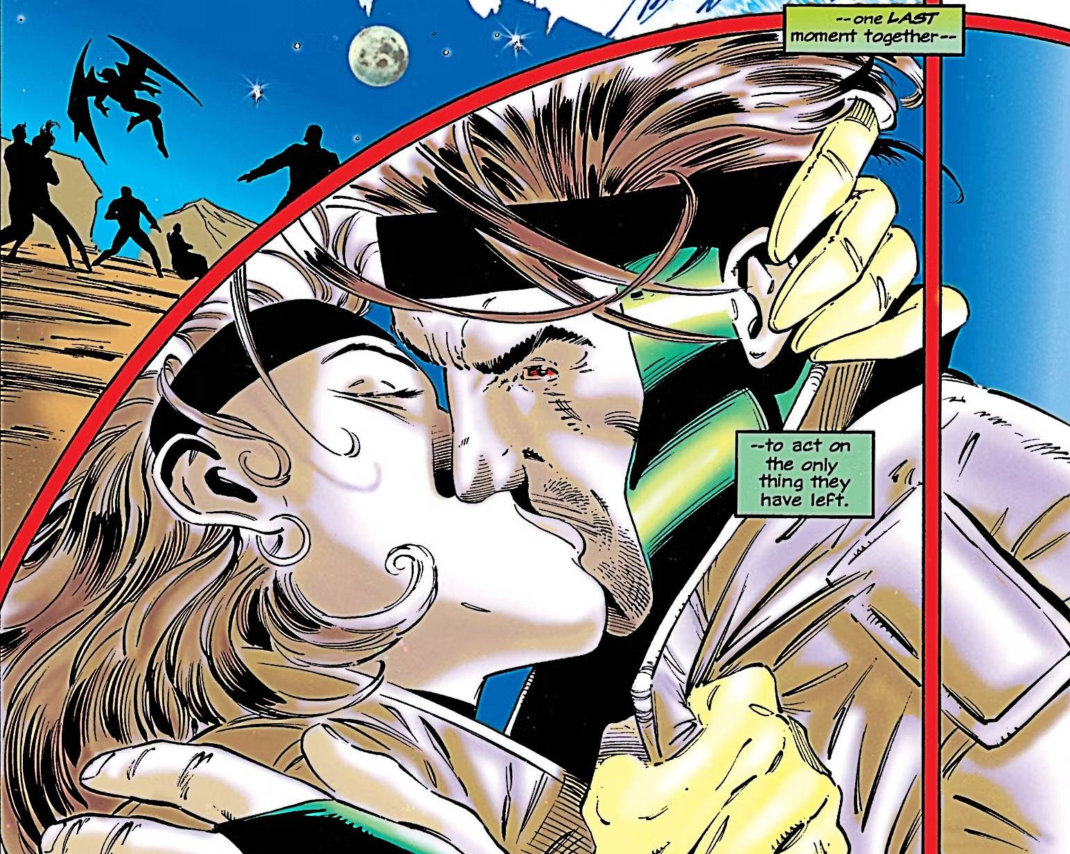 El momento culminante llegó a principios de 1995; sin embargo, más que el siguiente paso en la historia de amor de Gambit y Rogue, el beso vino justo cuando X Men estaba dando un salto ambicioso, embarcándose en su historia más ambiciosa (y más recordada) de la década: Era del Apocalipsis. Como es apropiado para un romance de alto riesgo entre miembros del principal equipo de superhéroes mutantes del Universo Marvel, el primer beso de Rogue y Gambit se produjo ante el miedo y la incertidumbre. Con sólo unos segundos para lidiar con la aparente posibilidad de aniquilación, Rogue decidió renunciar a la precaución y abrazar a su amante.