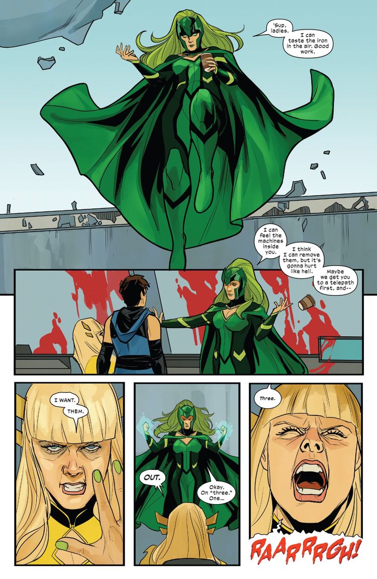 Ahora, con los mutantes haciendo su última resistencia contra Orchis, Polaris ha llegado para darle su propio toque a este momento clásico. Magik estaba lista para sucumbir a los nanocitos en su torrente sanguíneo, y Polaris usando sus poderes para eliminarlos era la única opción viable en ese momento. A diferencia de su padre, que atacó a Wolverine con celo, Polaris inicialmente se mostró reacia a realizar el procedimiento y sólo lo hizo ante la insistencia de Magik. Si bien Polaris obtuvo el consentimiento para arrancar los nanocitos, no pudo aliviar el dolor de Magik.