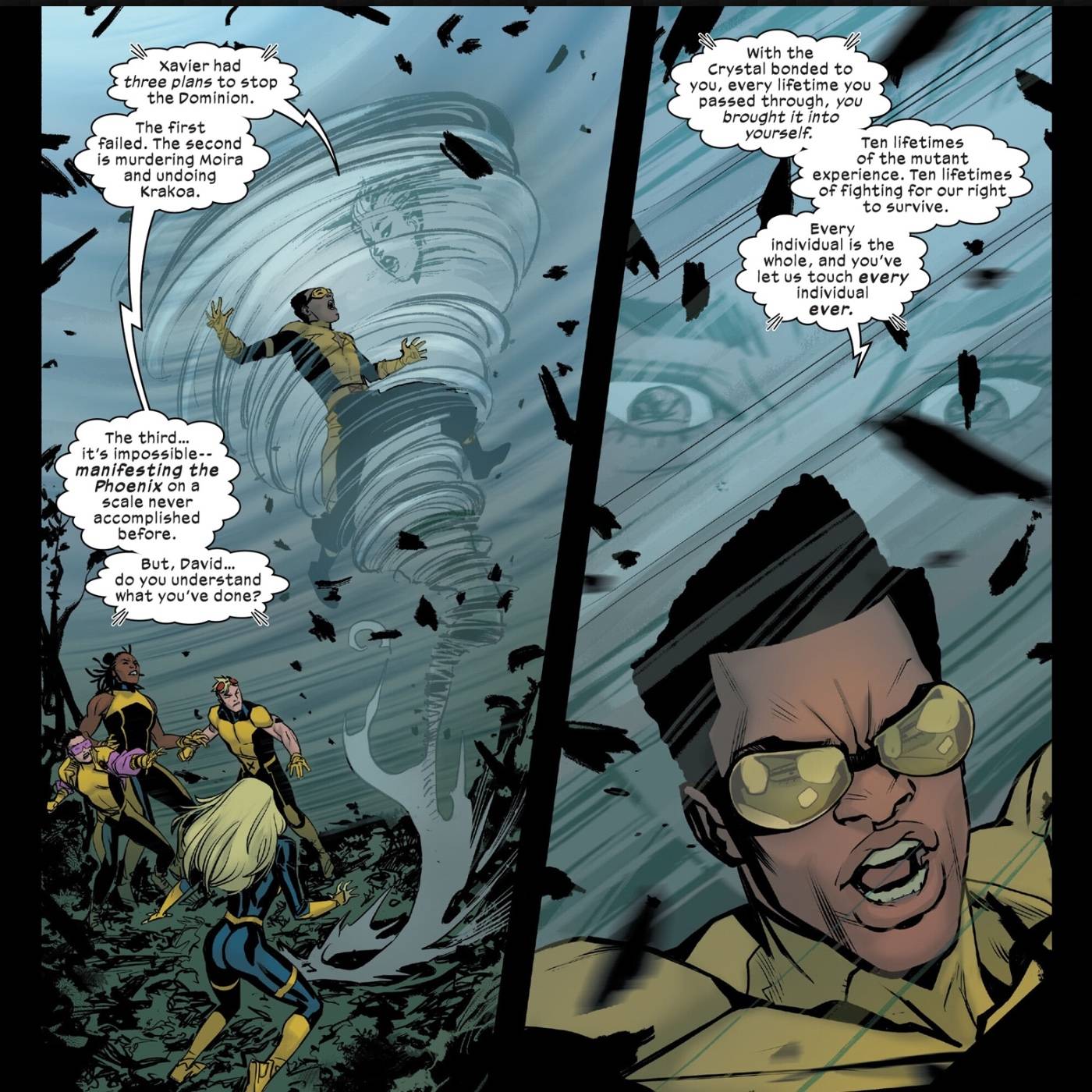 X-Men muertos #4 de Steve Foxe, David Baldeón, Bernard Chang, Vincenzo Carratù, Frank Martin y Cory Petit de VC establece los planes de Rachel Summers para manifestar el Fénix a una escala inimaginable. Su plan es utilizar las experiencias ambientales recopiladas por la conexión de Prodigy a través del Cristal M’kraan con las diez vidas de Moira X. junto con cada persona viva en esas realidades.