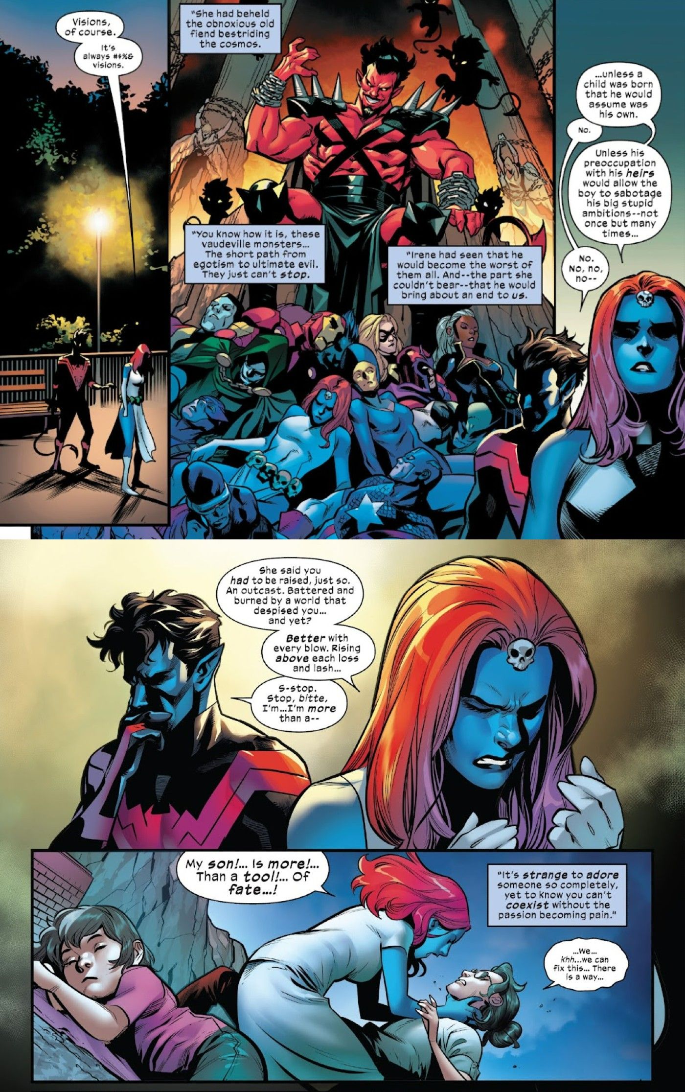 Finalmente, Mystique tiene la oportunidad de reparar su relación tensa y llena de arrepentimiento con su hijo Kurt, un Héroe con un suministro aparentemente interminable de perdón y comprensión dentro de su corazón.. Puede que no ocurra lo mismo con la relación de Nightcrawler y Destiny, ya que fue ella quien tomó la decisión activa de sacrificarlo y abandonarlo para ser un peón. De todos modos, aunque hay mucho trabajo por hacer, la revelación del trágico secreto del nacimiento de Nightcrawler les brinda a él y a sus madres una oportunidad de curación, tal vez inspirando el icónico X Men personajes para ser la familia que siempre añoraron en secreto.
