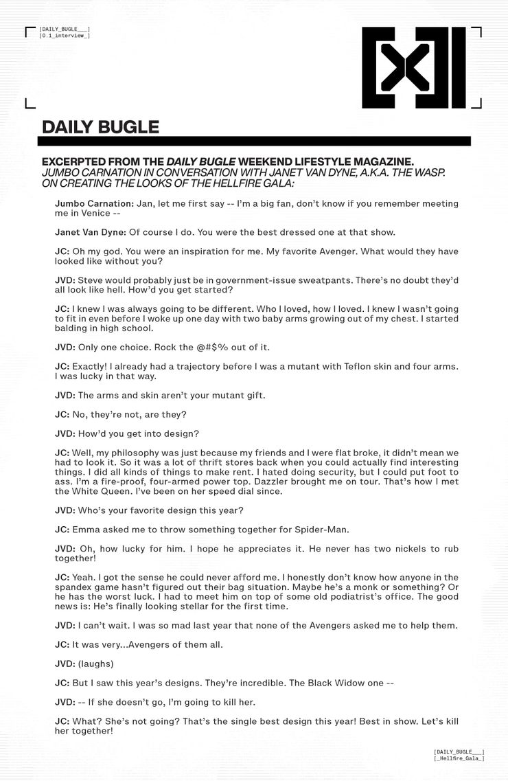 Más superhumanos que nunca asisten a la segunda gala anual Hellfire. El extraordinario diseñador de moda mutante Jumbo Carnation fácilmente tiene sus cuatro brazos llenos, asegurando que los mutantes de Krakoa estén dando lo mejor de sí. Entra Janet Van Dyne, la diseñadora de moda no mutante residente del Universo Marvel. En términos generales, parece que Wasp se encargó de vestir a la mayoría de los invitados centrados en los Vengadores, mientras que Jumbo se centró más en los asistentes mutantes. Una página de datos en Gala del fuego infernal #1 detalla una entrevista del Daily Bugle entre los jefes de las casas de moda Carnation y Van Dyne.