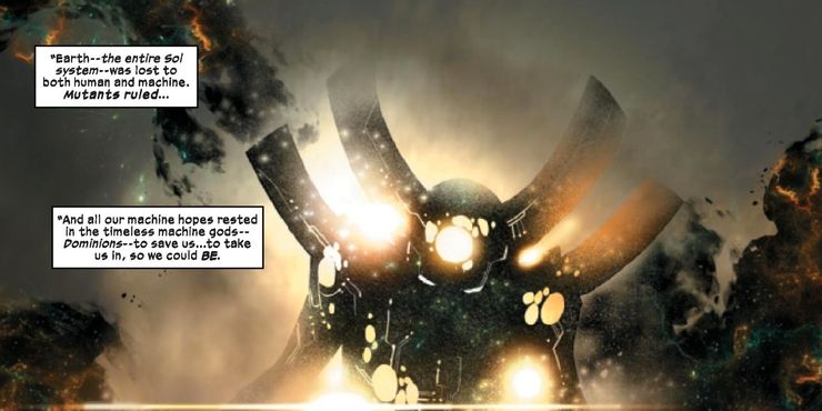 Durante la pelea, Omega y Nimrod afirman claramente que consideran a los humanos como mutantes, como sus enemigos y formas de vida inferiores. De hecho, comienzan el enfrentamiento masacrando sin piedad a los soldados de a pie de Orchis, sin otra razón que demostrar que los humanos no valen nada. “No hay diferencia entre ustedes [human and mutants]”, Omega le dice a Magneto,”Ese es nuestro secreto. Lo mantuvimos cerca, escondido del mundo, pero aquí está: los odiamos tanto como te odiamos a ti.Esto demuestra que la carrera por el futuro nunca fue entre mutantes y humanos, sino entre las máquinas y todos los demás. Este ha sido un tema destacado en la carrera de Hickman. El poder único de Moira de reencarnación y reinicio del universo después de su muerte ha brindado la oportunidad. para explorar diferentes líneas de tiempo futuras alternativas.En una de ellas, las máquinas y sus dioses, los Dominios, triunfan sobre cualquier otra forma de vida.
