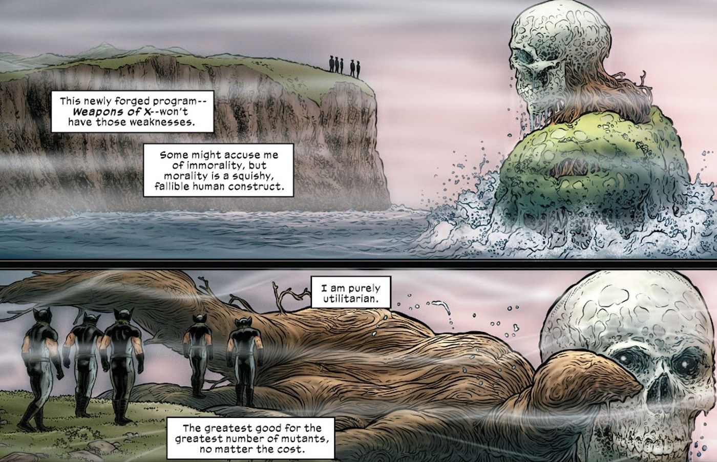 A lo largo del problema, Beast Prime esencialmente describe las Armas de X como un sistema bien engrasado que depende de su control. Al elevarse literalmente sobre sus compañeros Hanks como Beast Prime, está trazando una línea clara de superioridad sobre aquellos a los que considera sus subordinados, otro indicador más de cuán distante se ha vuelto incluso de su propia humanidad. No solo eso, sino que está claro que, a pesar de su propio sentido de importancia personal establecido desde hace mucho tiempo, ya no se ve a sí mismo como un héroe, sino como el núcleo de un sistema más grande y más frío. La base de Armas de X es un cuerpo esquelético gigantesco que Beast Prime puede controlar, y no es coincidencia que se siente en el lugar del cerebro.