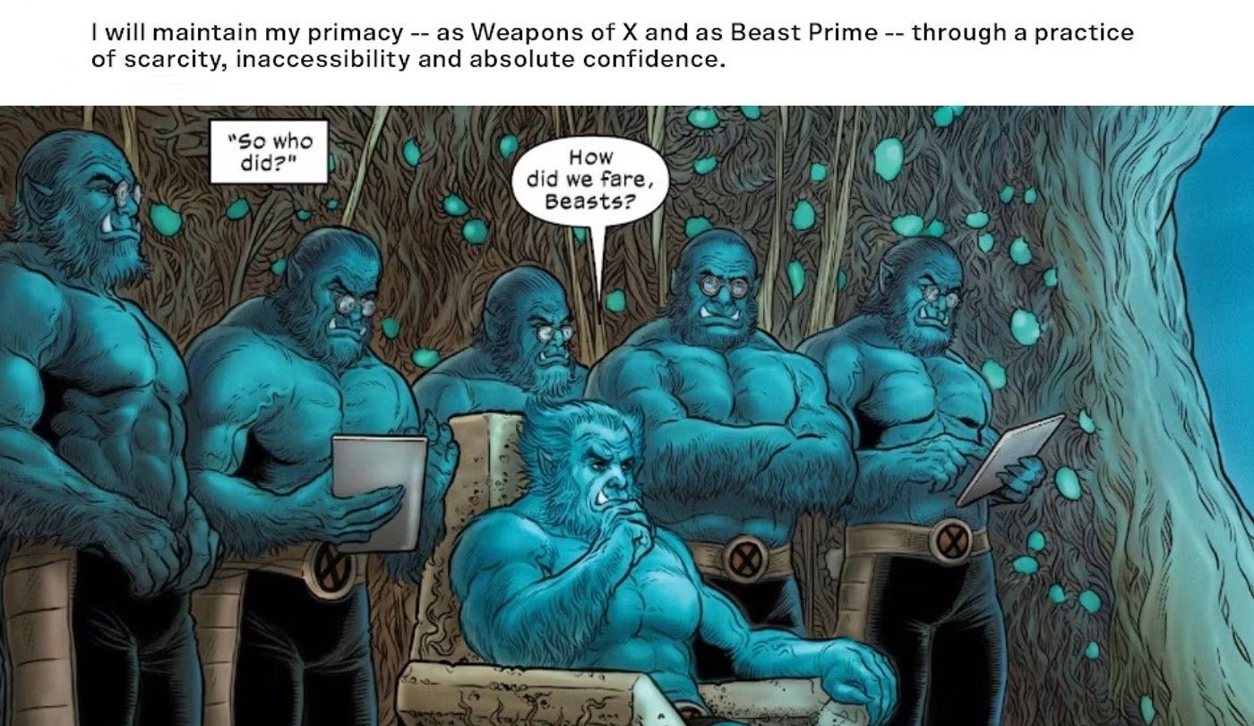 Lobezno #32 retoma a Beast, ahora identificándose como Beast Prime, al frente de las operaciones de su programa Armas de X, tripulado por clones sin sentido de Wolverine y clones subordinados de sí mismo. En una de las páginas de datos del número, explica el razonamiento detrás de su apodo Beast Prime como una forma de mantener su jerarquía entre sus seres inferiores, justificando mantenerse por encima de sus clones al afirmar: “La familiaridad engendra desprecio, como dicen.Si bien este tipo de perspectiva fría y calculadora es algo que los fanáticos esperan del ex X-Man en los últimos años, está muy lejos de la persona que solía ser la Bestia que rebota. Y es aún más aterrador cuando se consideran realmente las implicaciones de su nueva mentalidad.