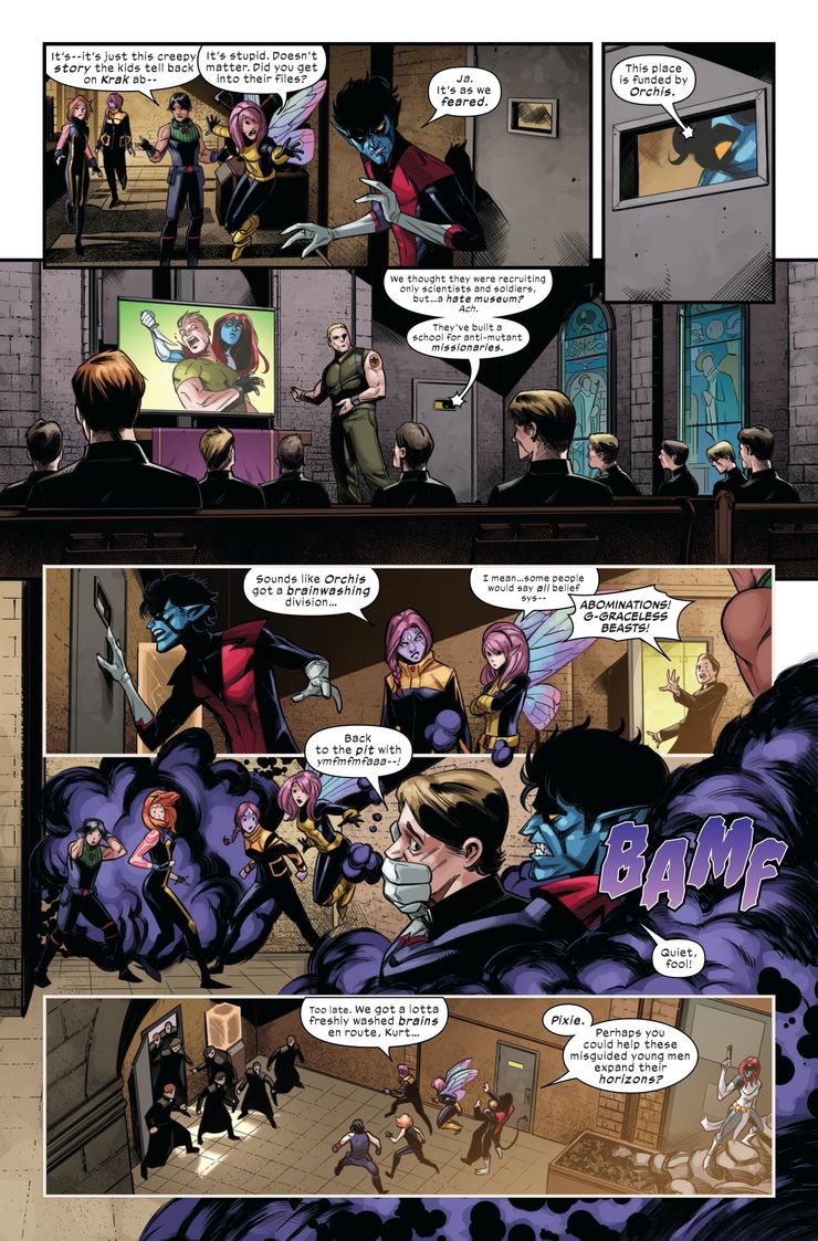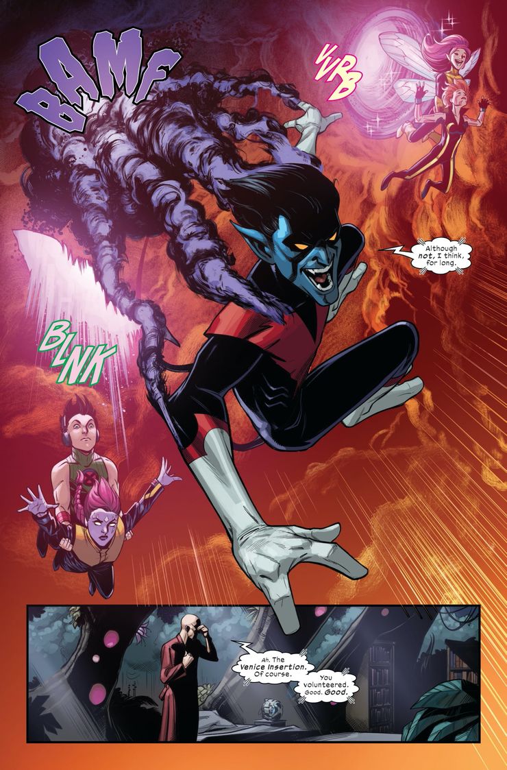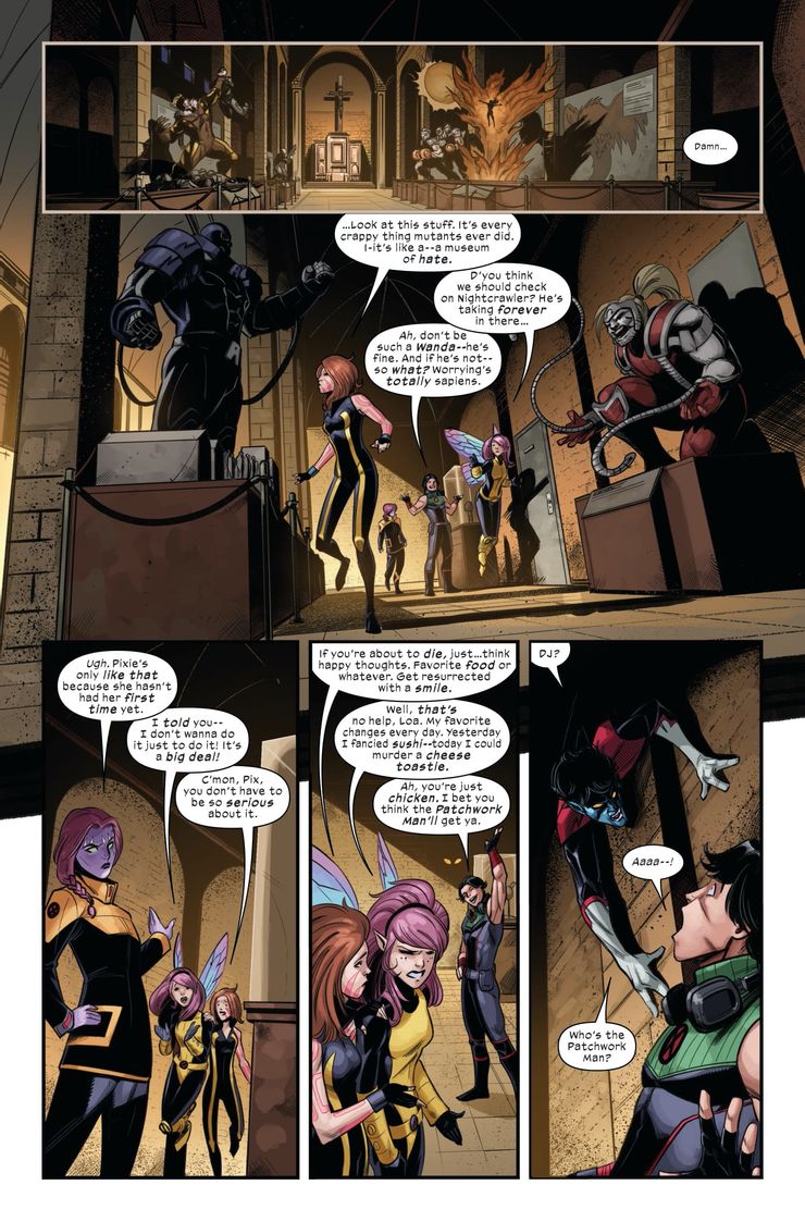 La vista previa comienza con el Profesor X revisando a Nightcrawler, que se encuentra en Venecia llevando a cabo una peligrosa misión con un equipo de mutantes, incluido Pixie. El equipo llega a su destino, y mientras investigan, uno de ellos se refiere a otro como un “Wanda” – una excavación en la Bruja Escarlata. Los mutantes sienten que preocuparse es una cosa humana y ellos equiparan ser resucitado con perder la virginidad. términos como “la primera vez”. Incluso tienen su propio hombre del saco: el Hombre Patchwork.