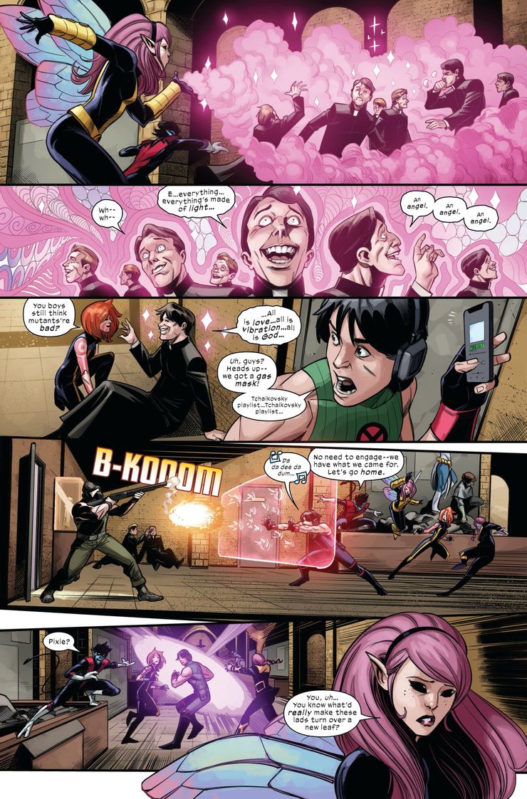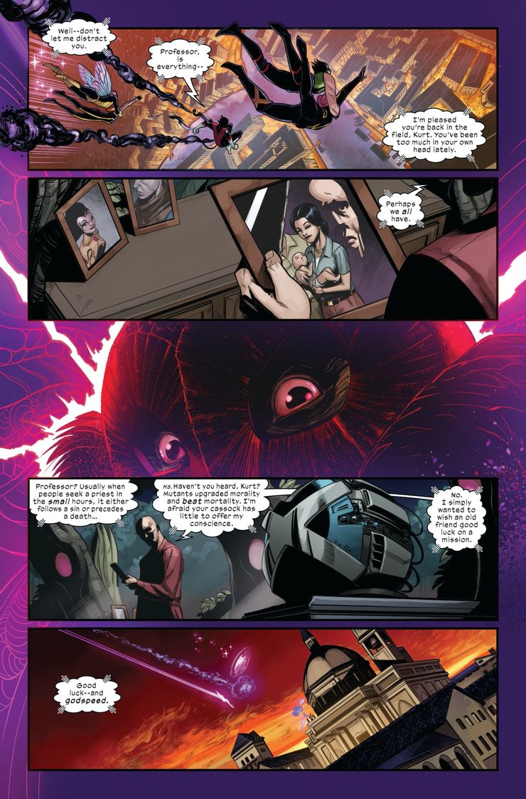 Hay mucho que desempacar en la breve vista previa. El uso del término “Wanda” como un insulto es una referencia obvia a Wanda Maximoff, también conocida como La Bruja Escarlata, un personaje que alguna vez se creyó que era un mutante, pero ha salido a la luz desde que no lo es, y por lo tanto no lo sería. muy visto en Krakoa. Los Protocolos de Resurrección, que permiten que cualquier mutante fallecido vuelva a la vida, es otro aspecto clave de Krakoa y la cultura mutante; varios mutantes ya lo han atravesado, tanto que se ha convertido casi en un rito de iniciación en Krakoa, y los mutantes más jóvenes lo ven de manera similar a los humanos que pierden su virginidad. También hay ataques a los humanos. El uso de Nightcrawler en esta situación refuerza la nueva identidad mutante que se está formando: un devoto católico, la fe de Nightcrawler ha sido probada por la creciente cultura mutante en Krakoa.