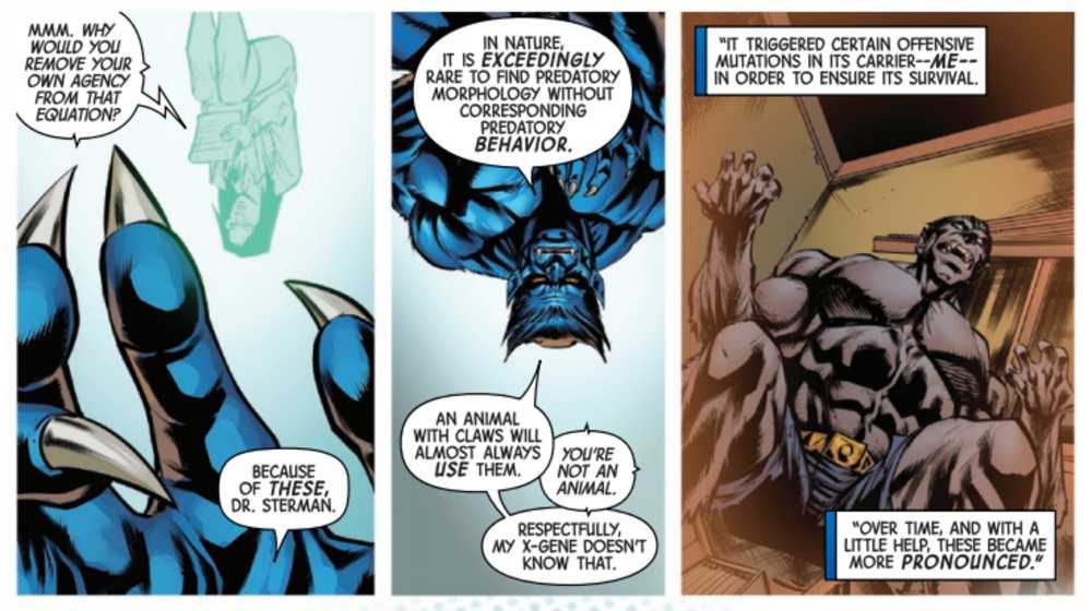 Hay muchos ejemplos de poderes mutantes que también afectan la personalidad de sus manejadores, pero debido a que los poderes de Beast hacen que se vuelva menos humano con el tiempo, nunca se ha notado hasta ahora. Sin embargo, la explicación explica los momentos en el pasado cuando Beast ha sido particularmente imprudente, como llevar a los X-Men adolescentes al presente y dañar el tejido del espacio-tiempo. También explica por qué la contraparte de Beast de la Era del Apocalipsis es tan totalmente amoral, a pesar de ser esencialmente la misma persona.
