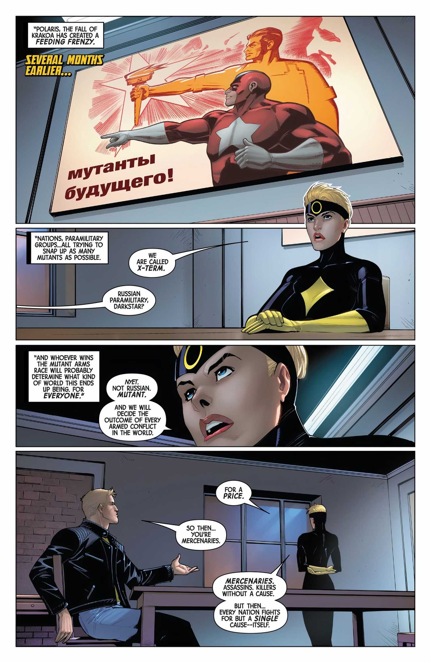 Factor X El número 1 fue escrito por Mark Russell y dibujado por Bob Quinn. Havok está debatiendo si unirse a la última encarnación de X-Factor. Esta nueva versión cuenta con patrocinio corporativo, y Havok lucha con esto. Polaris escucha y Havok, en un intento de racionalizar lo que está haciendo, le informa que después de que Krakoa cayera, instigó una “carrera armamentista mutante”, en la que las naciones y los grupos paramilitares comenzaron a reclutar mutantes para sus filas.