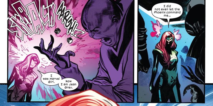 En X-Men #11 por Gerry Duggan y Pepe Larraz, los X-Men han viajado a un casino del espacio profundo conocido como Gameworld donde alguien anima apuestas sobre la destrucción de la Tierra. Los X-Men usan una conexión hecha por Rogue para infiltrarse en este sórdido planeta y llegar al fondo de la amenaza del fin del mundo. Jean Grey confronta a los alienígenas reunidos con una demostración de poderes, declarando que no la usarán como juguete. Mientras domina absolutamente la habitación, Jean afirma definitivamente: “Yo era la Chica Marvel. Ahora soy Jean Grey”.